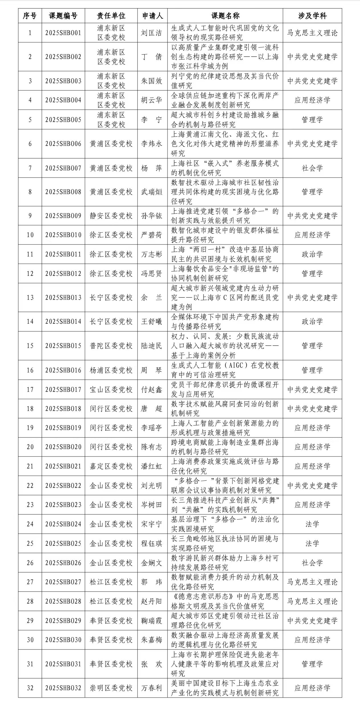 2025年度上海市党校(行政学院)系统课题,经申报受理、专家评审、学术委员会审议、网上公示,已完成全部评审程序。经校委会最终审定,现将立项名单予以公布。