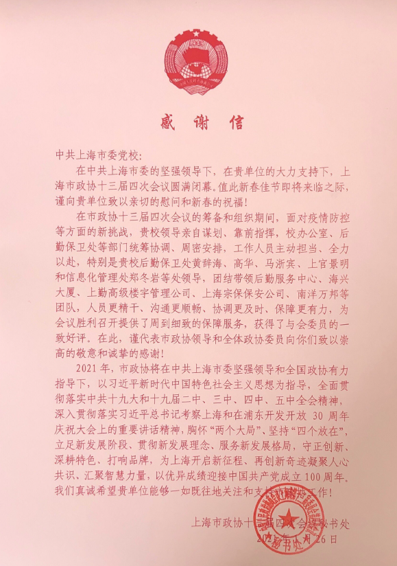 本网讯 1月26日下午,市政协十三届四次会议胜利闭幕。1月27日下午,海兴大厦及周边停车场区域解除管控。至此,我校圆满完成市政协十三届四次会议的保障服务工作。市政协特地发来感谢信,对我校全力保障服务会议胜利召开给予高度肯定。