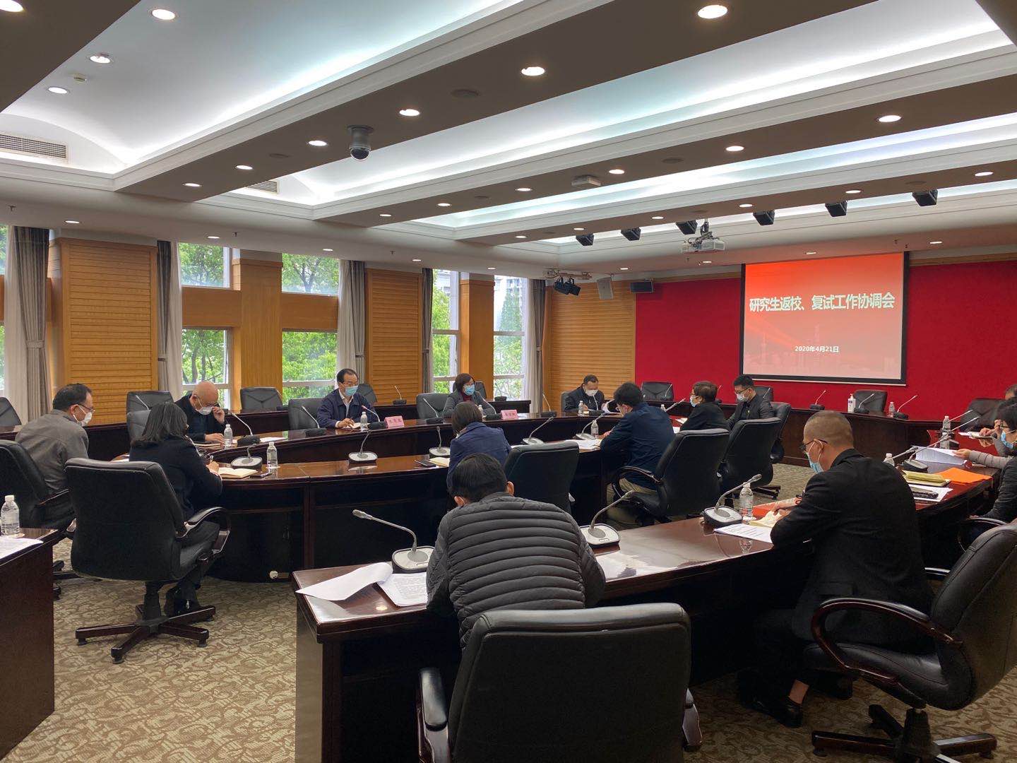 本网讯 4月21日下午,校院召开研究生返校、复试工作协调会。副校院长朱亮高主持会议,教育长梅丽红出席会议,校办公室、工会、研究生部、信息化管理处、后勤保卫处、图书馆、后勤服务中心等部门负责人以及物业、安保负责人、辅导员和研究生部全体人员参会。