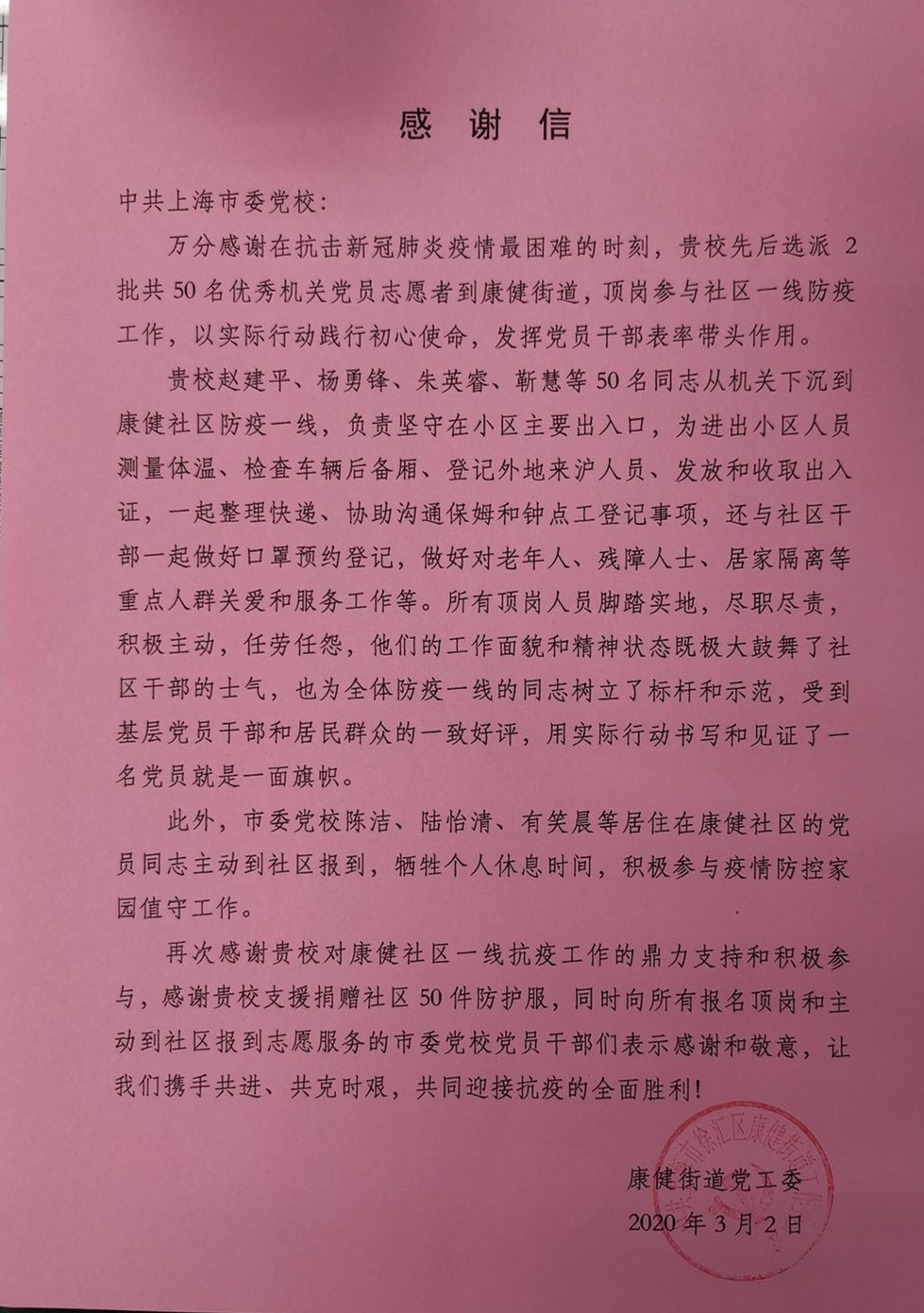 本网讯 “疫情越是胶着的时候越是不能放松。”“社区是疫情防控基础和关键的一环。”在全国抗击疫情迎来重大转折的时刻,社区疫情防控工作仍然十分重要和吃紧。2月24日,市委党校从踊跃报名参加疫情防控的教职工中选出30名顶岗人员,派往徐汇区康健街道参加一线疫情防控工作。3月1日,为期一周的顶岗人员工作顺利结束。一个星期以来,顶岗人员们牢记初心使命,以满腔的热情和负责的态度投入到抗击疫情工作中,正如赵勇同志所言,努力做好疫情防控的一枚“螺丝钉”。他们扎实细致的工作赢得了街道干部和居民同志的交口称赞,也展现了市委党校教职工良好的精神面貌。