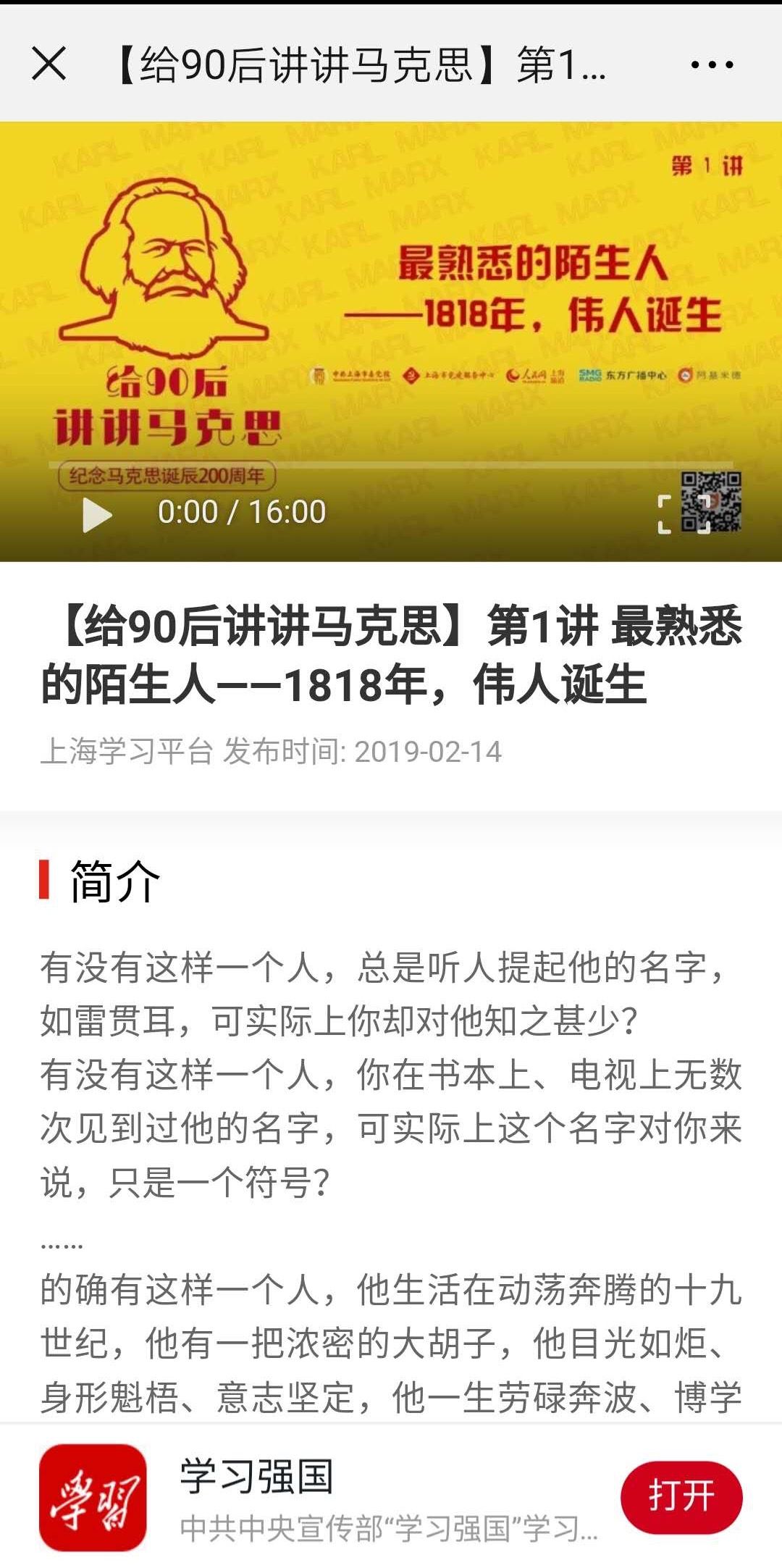本网讯 近日,由我校作为制作方之一制作的《给90后讲讲马克思》系列音频党课在“学习强国”学习平台播出。《给90后讲讲马克思》是一档为90后度身定制的音频党课,采用更符合新媒体收听和传播特点的短音频,通过介绍贯穿马克思一生的19个小故事,帮助现在的年轻人更好地了解马克思这位伟人的一生以及他的重要思想成果对于当代中国的意义。