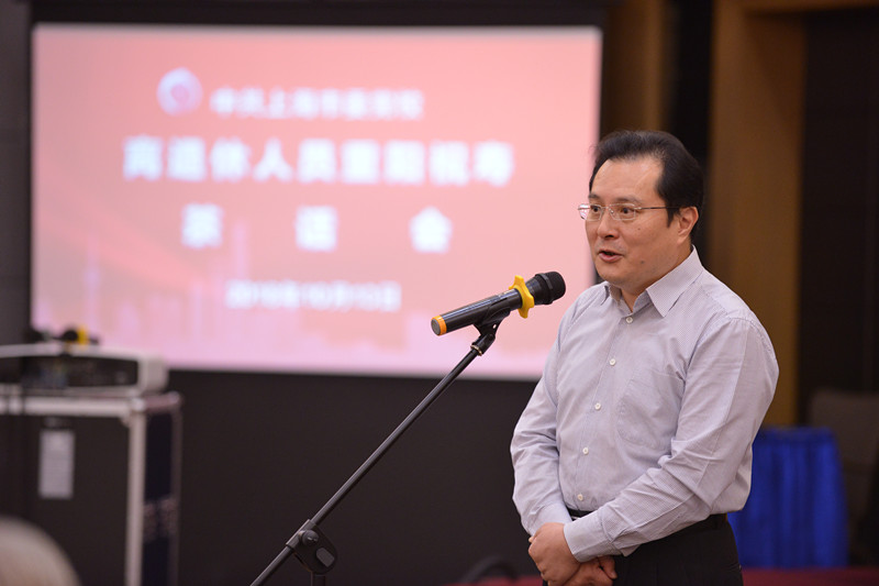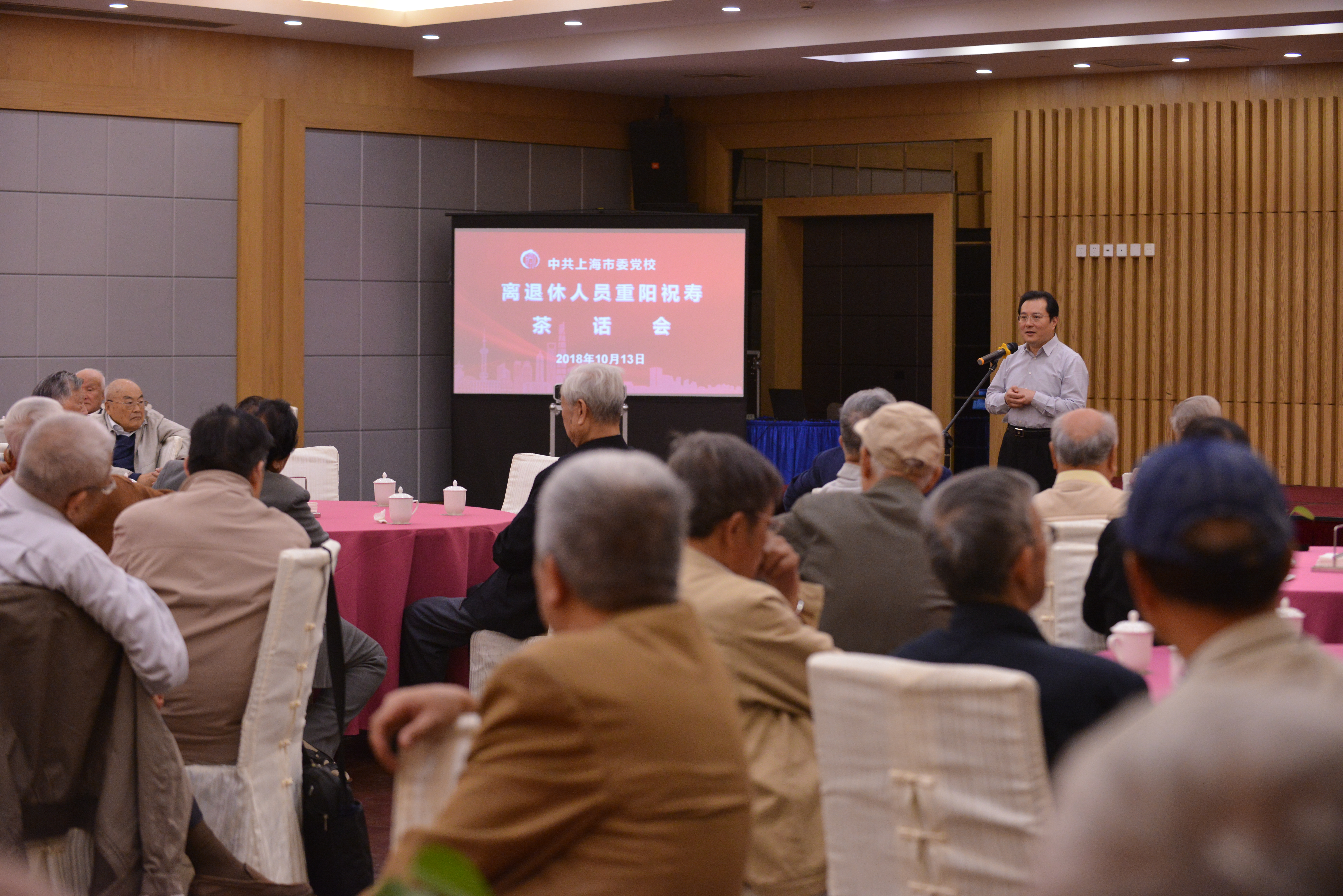 本网讯 10月13日,值全国第六个法定老年节暨上海市第三十一届敬老节即将到来之际,校院在海兴三楼多功能厅召开离退休人员重阳祝寿茶话会,为离退休老同志集体祝寿。常务副校院长沈炜出席茶话会,与老同志共话发展、共贺佳节。近百位适逢70周岁和80周岁及以上的离退休老同志代表参加活动。