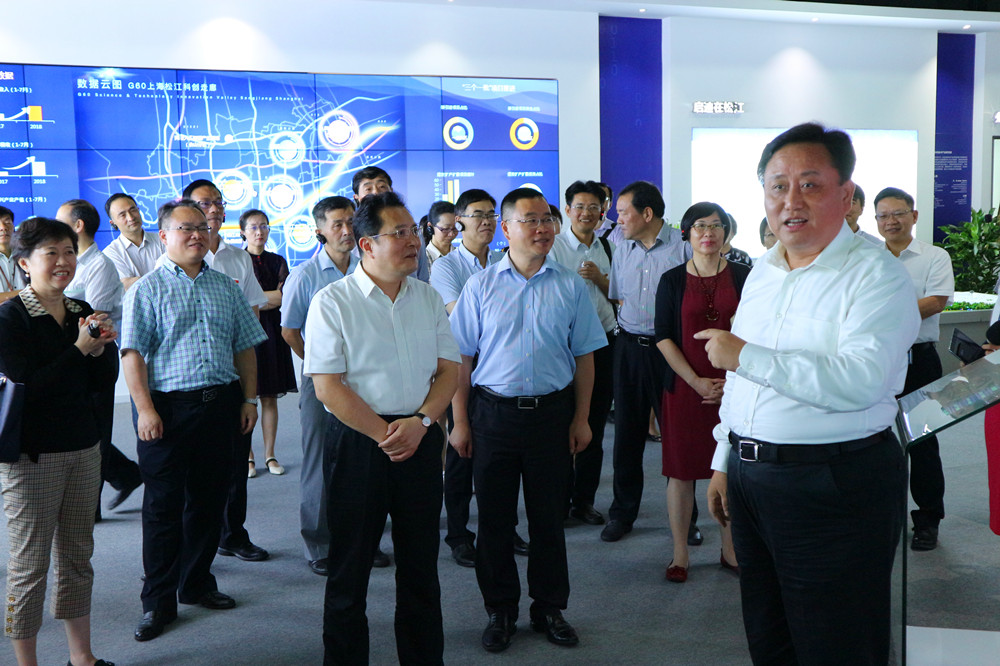 在G60科创走廊规划展示馆,两级中心组一行深入了解了G60科创走廊顶层制度设计和G60科创走廊从1.0版、2.0版到3.0版的发展历程,以及G60科创走廊重点产业、龙头企业发展情况。随后,两级中心组一行考察了广富林文化遗址,详细了解了人文松江建设等情况。