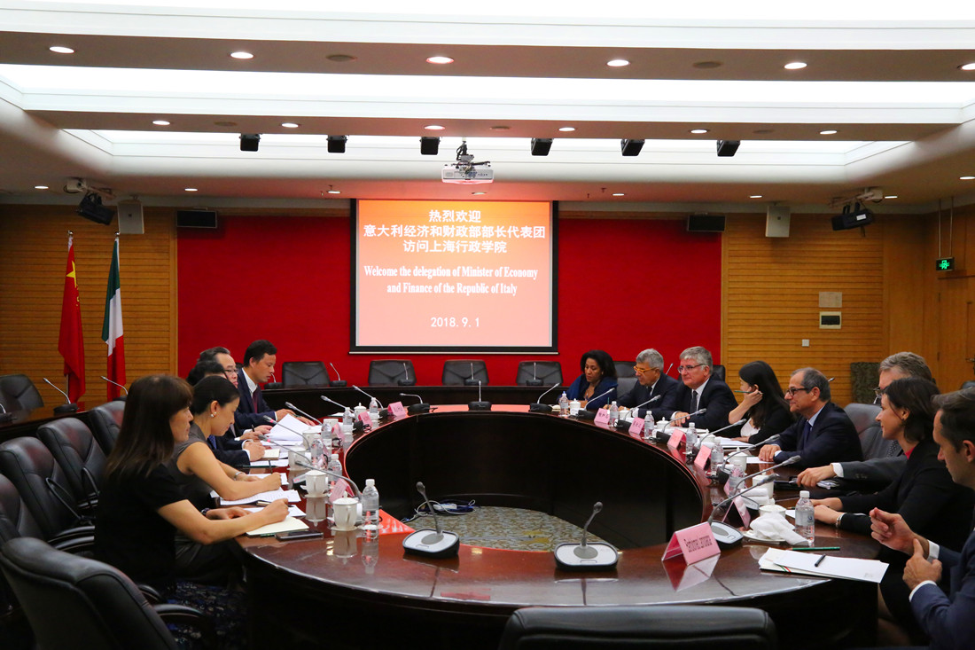 本网讯 9月1日下午,意大利经济和财政部部长特里亚一行在意大利驻上海总领事的陪同下来访上海行政学院,常务副院长沈炜主持会见,副院长郭庆松陪同会见。
