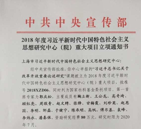 本网讯 近日,经中央宣传部批准,由上海市习近平新时代中国特色社会主义思想研究中心申报的“习近平总书记关于改革开放重要论述研究”课题被立为2018年度习近平新时代中国特色社会主义思想研究中心(院)重大项目,批准号2018XZD06,同时列为国家社科委托项目。