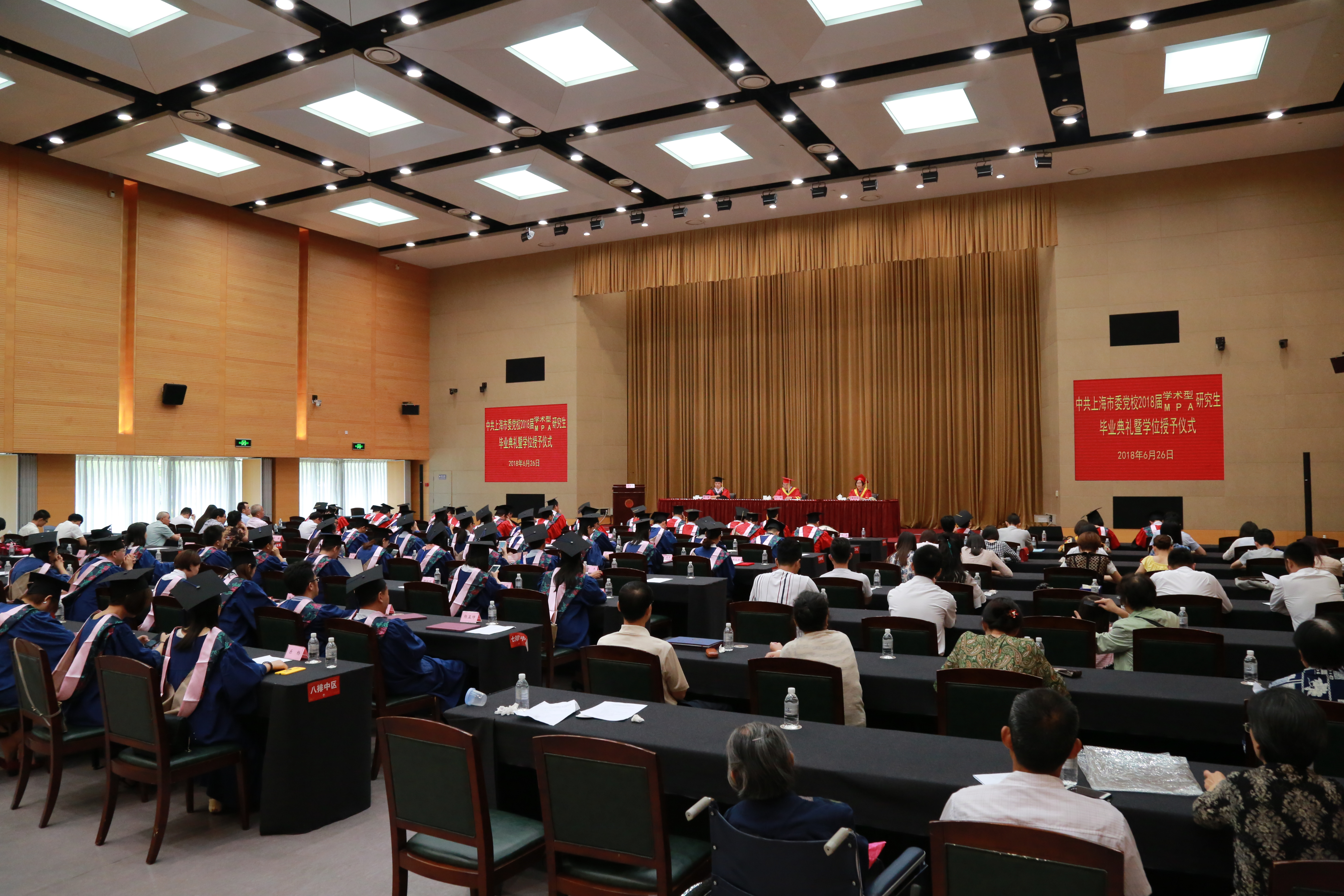 今年我校共有学术型研究生21名和首届MPA专业学位研究生23名顺利学成毕业。其中,20位获法学硕士学位,1位获经济学硕士学位,23位获公共管理硕士学位。有1名学生获上海市普通高等学校优秀毕业生荣誉,6名学生获校优秀毕业生荣誉,9名学生获优秀毕业论文奖。毕业典礼上向这些同学颁发了学位证书、学历证书和获奖证书。2018届学术型毕业生韩前广和首届MPA毕业生刘刚代表毕业生发言,他们回顾了研究生期间的收获和成长,衷心感谢母校和师长的培养以及家人的支持,表达了牢记母校嘱托,不忘初心,继续奋斗的决心。现任上海体育学院办公室副主任,首届学术型硕士毕业生胡德平代表校友向毕业生献上寄语,希望党校培养的每一位学生都把高度的党性原则、社会责任、事业担当融入到骨子里,带着对时代和社会的关怀,相信奋斗和读书的力量,勇往直前,承担起一份对母校的责任,“因为你塑造的形象就是党校的形象”。导师代表赵勇教授与毕业生分享了自己对“留下”“我们”和“信仰”三个关键词的理解,盛赞毕业生们为母校留下的宝贵财富,勉励毕业生强化协作意识,树立团队观念,坚守信仰,感知真理的力量。