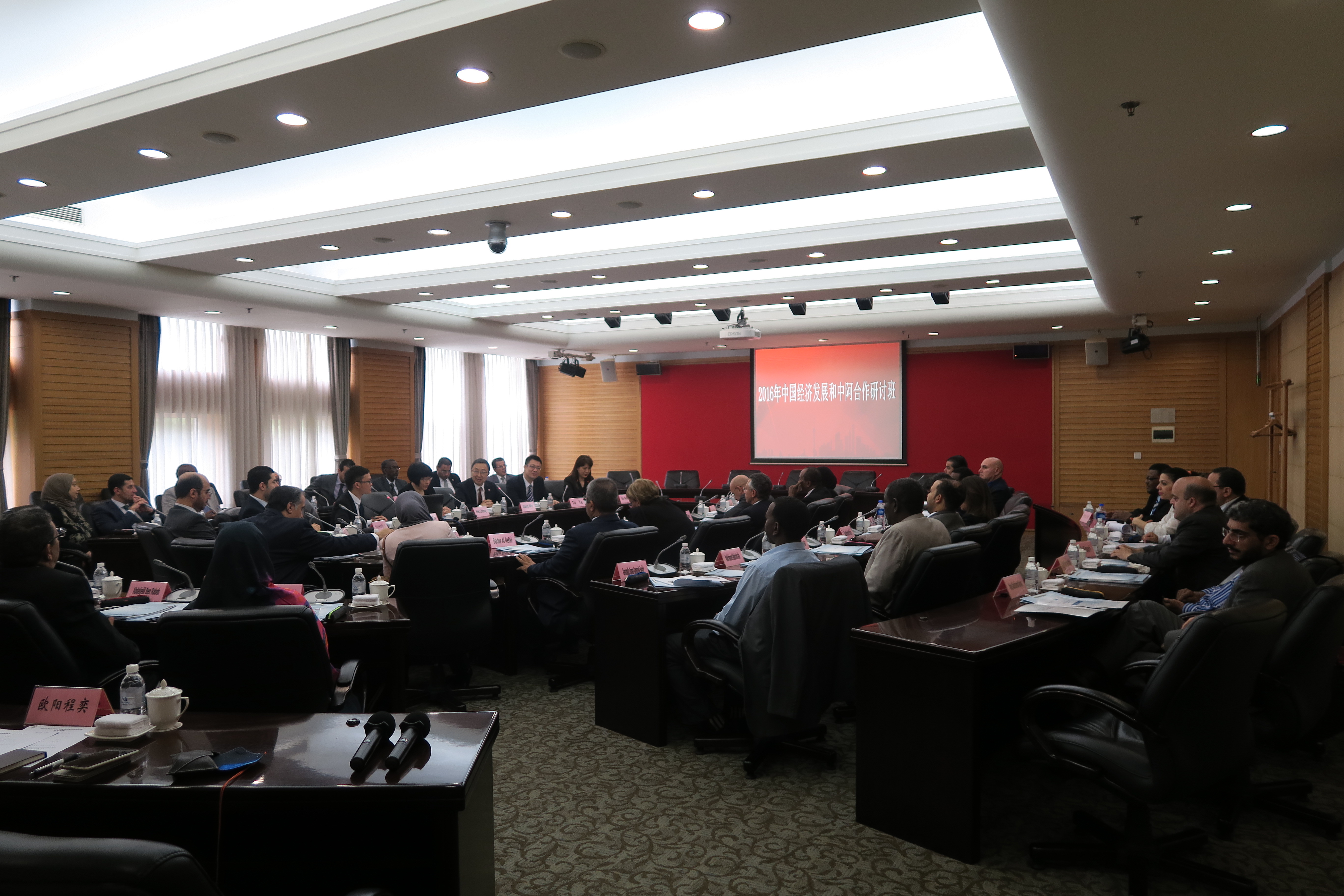 本网讯 5月31日,受国家行政学院培训中心委托,2016年中国经济发展和中阿合作研讨班来我院研修。该班学员由来自埃及、苏丹、阿尔及利亚等国家和国际组织的37名司处级官员组成,其中17位司局级,20位处级官员。国家行政学院培训中心副主任姜伟随班访问我院。