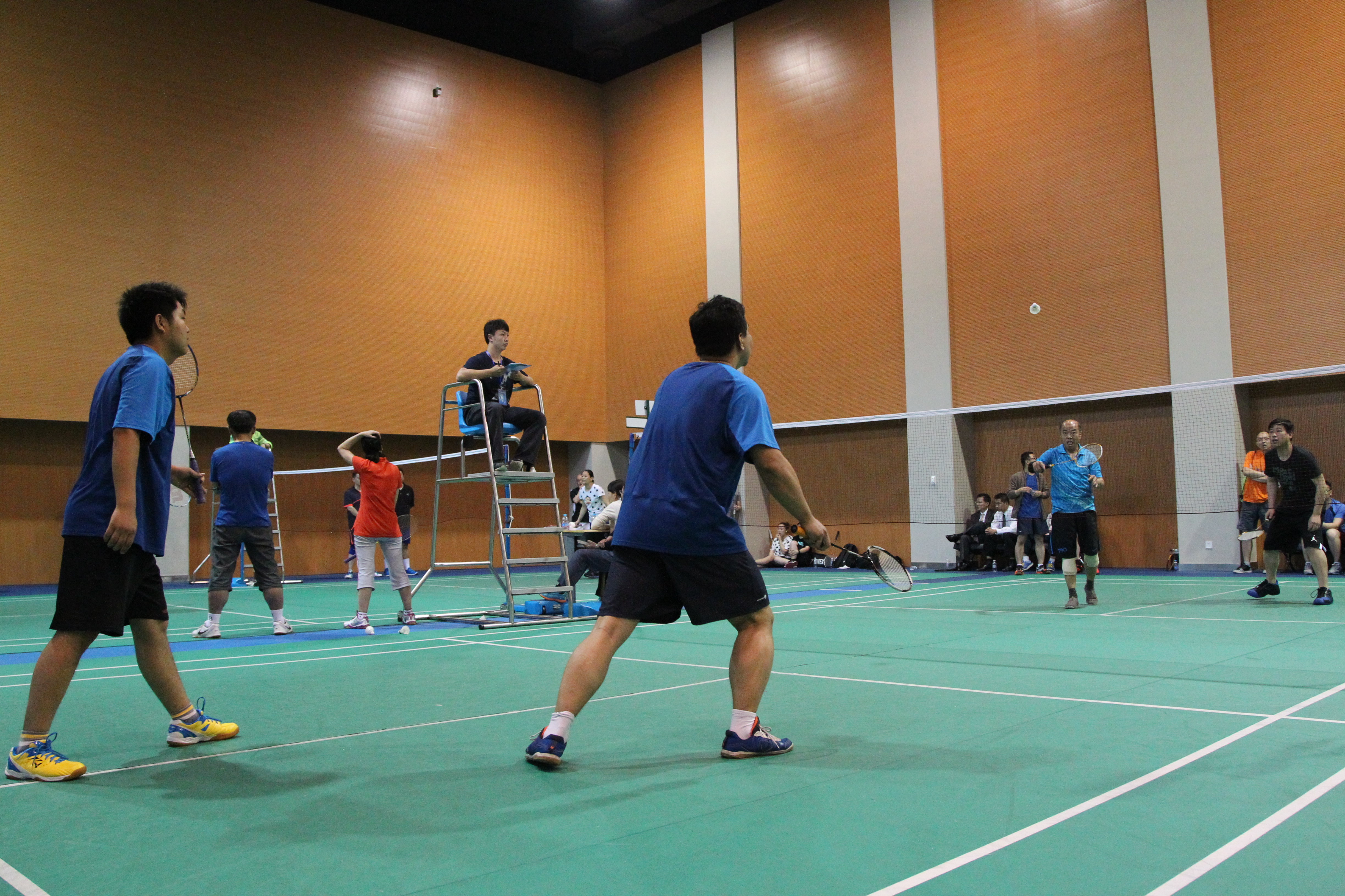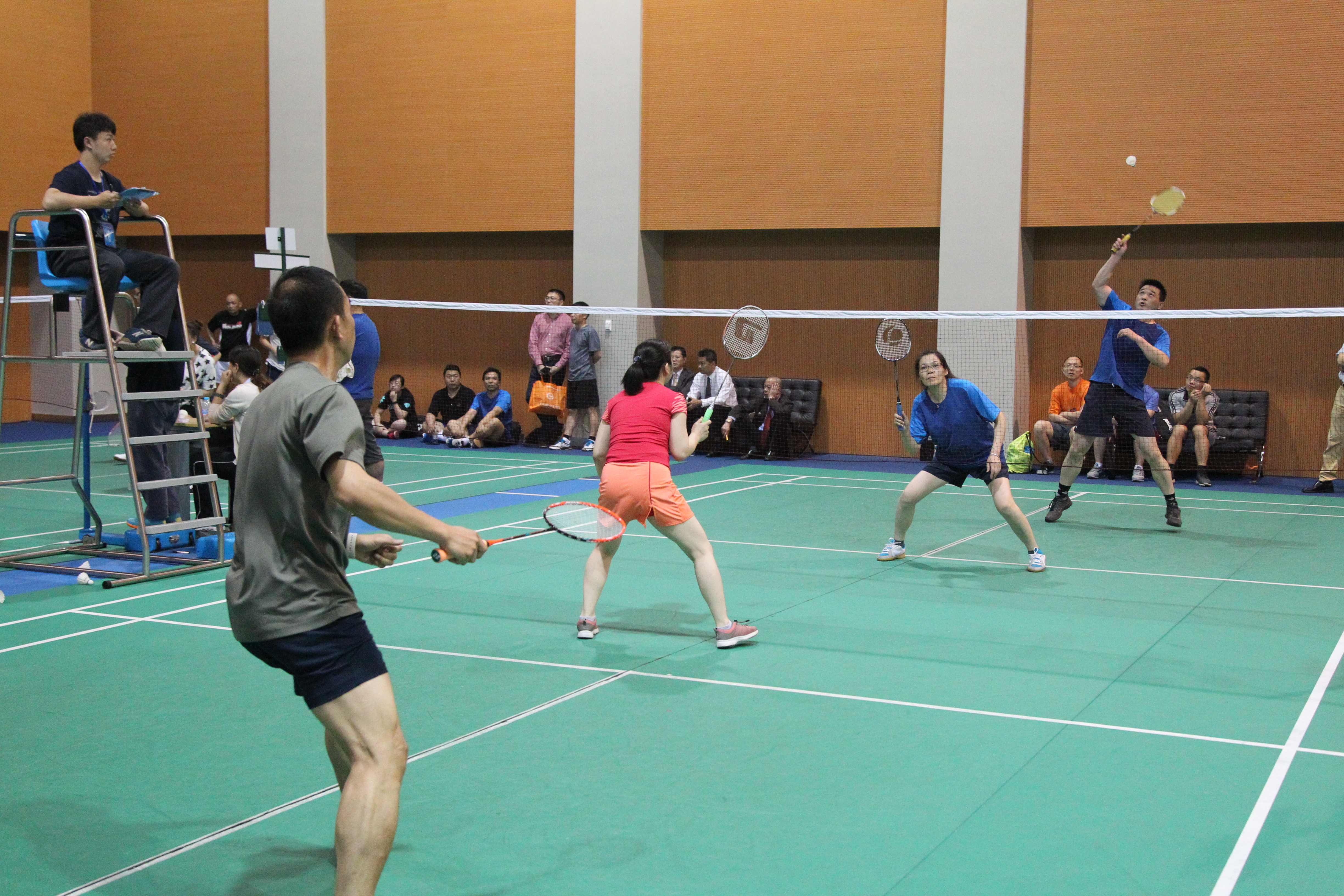 在为期三个半天的紧张比赛中,竞争激烈、精彩纷呈,教职工们活力四射、尽显风采。有的教职工一出手就是专业水准,打球不仅稳、准、狠,而且将高远球、扣杀、劈杀、吊球等发挥得淋漓尽致,网前截击巧破千斤,大力扣杀劈波斩浪,精湛的球技让比赛高潮迭起,令观赛者啧啧称赞。有的参赛队之间恰好棋逢对手,实力相当,小小的羽毛球,你来我往,眼花缭乱,喝彩声、加油声、欢呼声此起彼伏。最具娱乐性的要数女单比赛,虽然很多女选手技术水平有限,挥拍动作和脚步移动也略显笨拙,但是仍然坚持每球必争,决不轻易放弃,体现了体育运动的魅力。紧张的赛事也考验着场外领队的智慧,领队们一边观察对手实力、权衡优劣势,一边斟酌本队选手的出场顺序和排兵布阵。尽管汗水已湿透衣衫,但教职工都体会到了心情的愉悦、身体的放松。