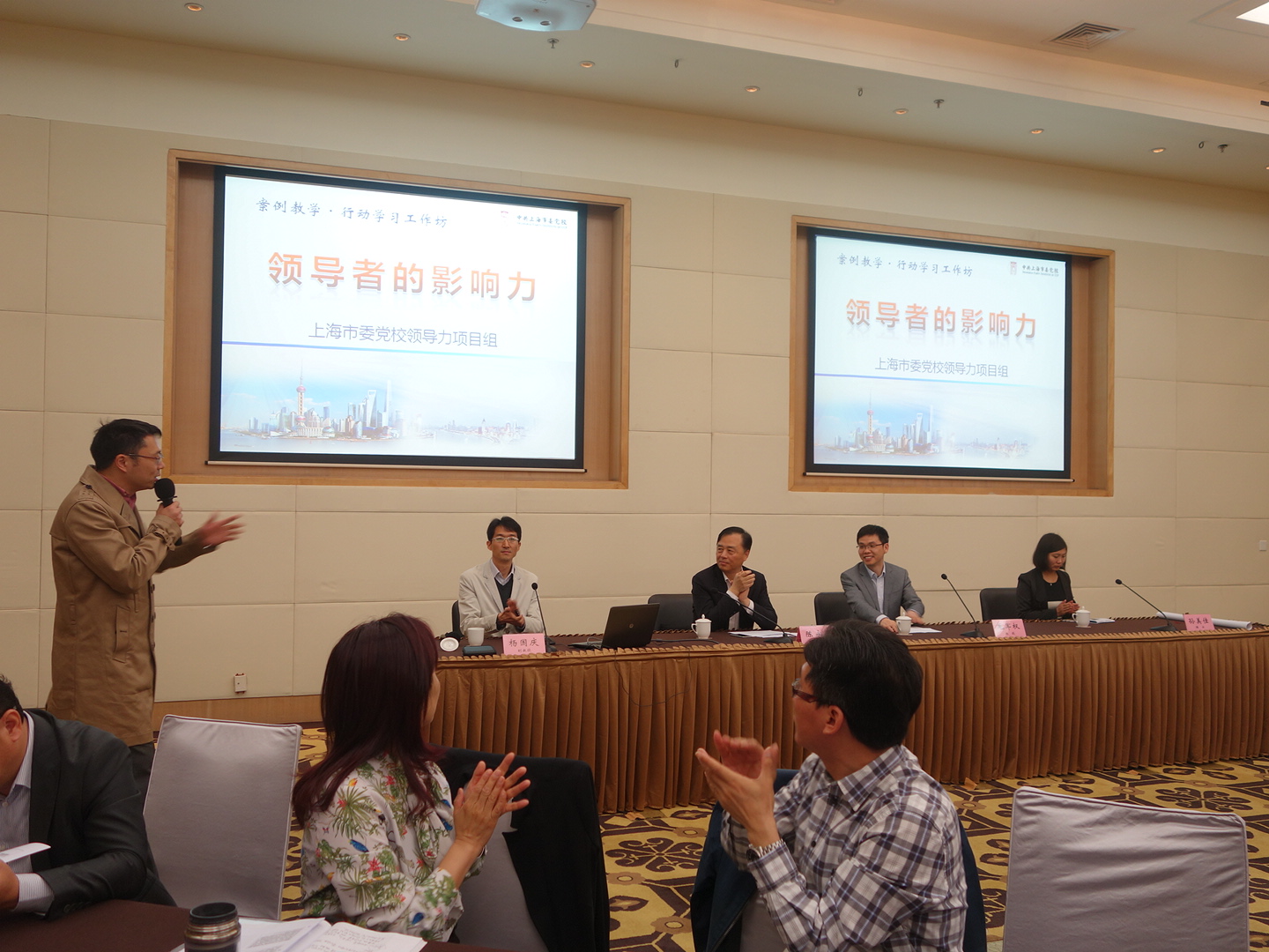 在案例教学的最后,静安区政协主席陈永弟结合自己的工作体会,对四个学员组的表现进行了点评,并分享了自己的从政体会和感受。他说,这四个案例突出体现了领导者的影响力包括以下四个要素:一是要有定力,要影响别人,前提是立得稳、站得住,成为主心骨;二是要有掌控力,要掌握一个部门,除制度保证外,核心是要有宽广的胸怀,把班子建设好、分工调配好;三是要有思想力,没有思想力产生不了影响力,“导”要靠思想;四是要有人格魅力,让下属在上级身上看到一种美德。陈永弟还就处理好“顶天与立地”“干事与共事”“带头与带队”三个关系寄语学员们做能带队的管理者。
