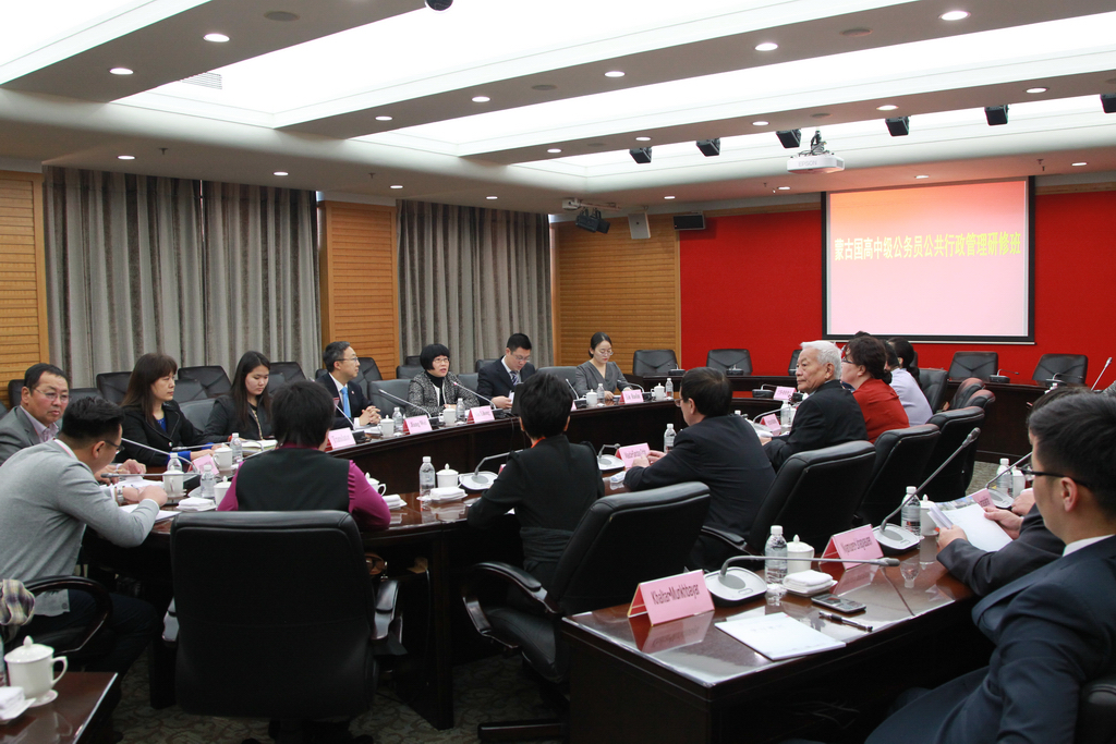 本网讯 受国家行政学院培训中心委托,12月7日,蒙古国高中级公务员公共行政管理研修班来我院研修。该班学员由来自蒙古内阁秘书处、国家行政学院、国防大学、教育部、财政部、劳动部的18名司处级官员组成。国家行政学院培训中心副主任姜伟随班访问我院。