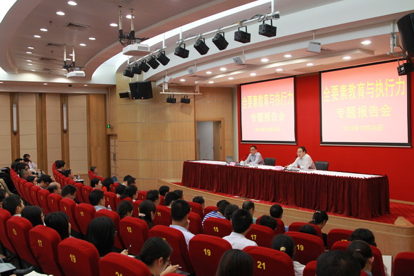 本网讯 10月24日下午1:30,校院在海兴教学楼101报告厅举行主题党课,副校院长徐卫应邀作“全要素教育与执行力”专题报告。主题党课由副校院长郭庆松主持。副巡视员张志伟、李宁和机关党委专职副书记赵伟忠出席,来自行政管理部门、后勤服务部门的教职工共150余人参加活动。