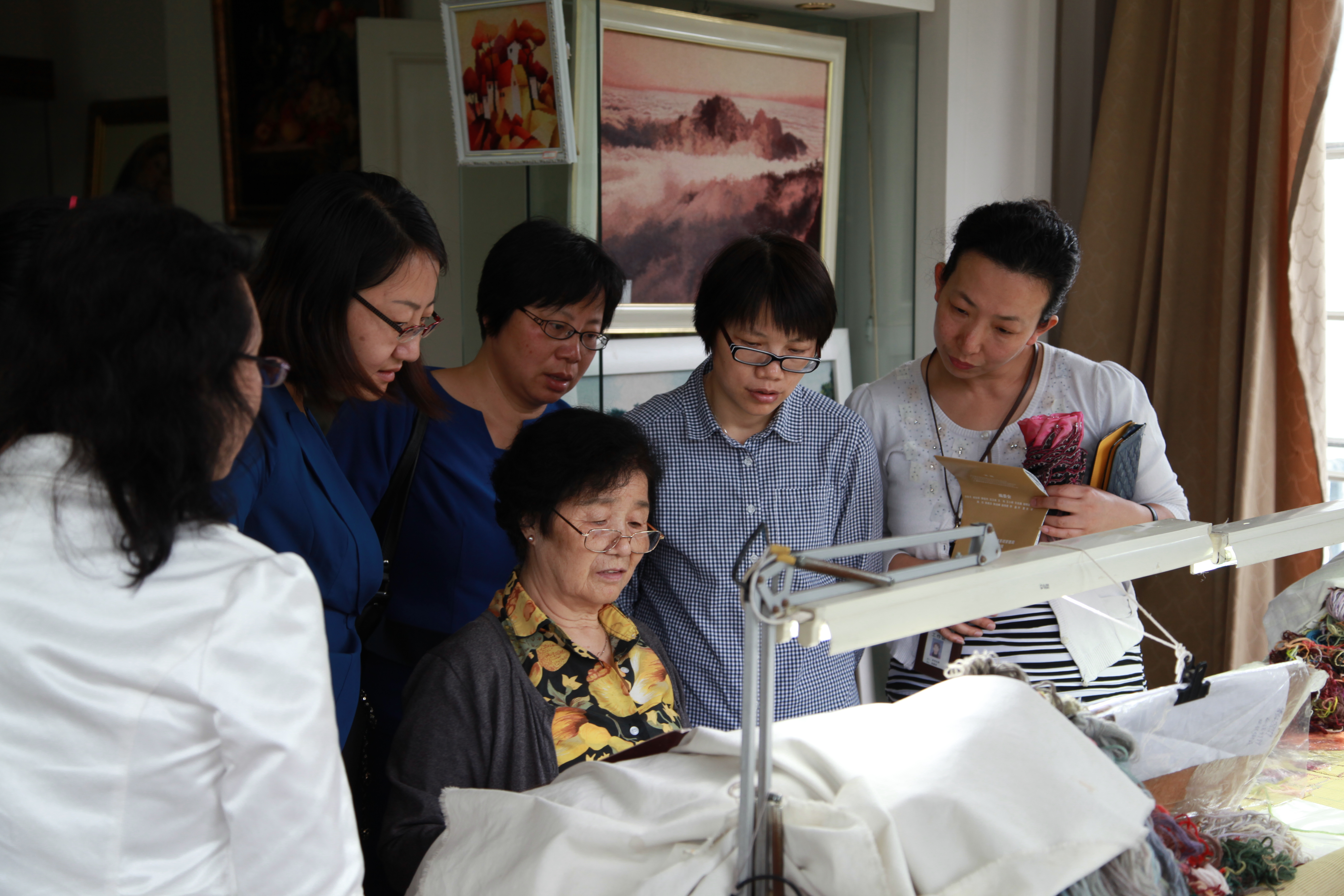 上海工艺美术博物馆原为法租界工董局董事住宅,建于1905年。走进欧式风格的大厅,看到陈列的各种精美的中式雕刻作品,通讯员们都眼前一亮。精巧的建筑与建筑内所陈列的精致的工艺品相映成趣、相得益彰。无论是玉雕还是木雕,无论是建筑还是人物雕塑,都笔法繁复,栩栩如生。通讯员走进艺人工作室,兴致勃勃观看艺术家们现场打磨各类玉器,看苏绣传人巧手如蝴蝶翻飞绣出几可乱真的美丽图案。通讯员感慨,无论是雕塑,还是刺绣,都跟写文章一样,要精雕细刻,仔细打磨,只有沉得住气,静得下心,耐得住寂寞,方能宁静致远。