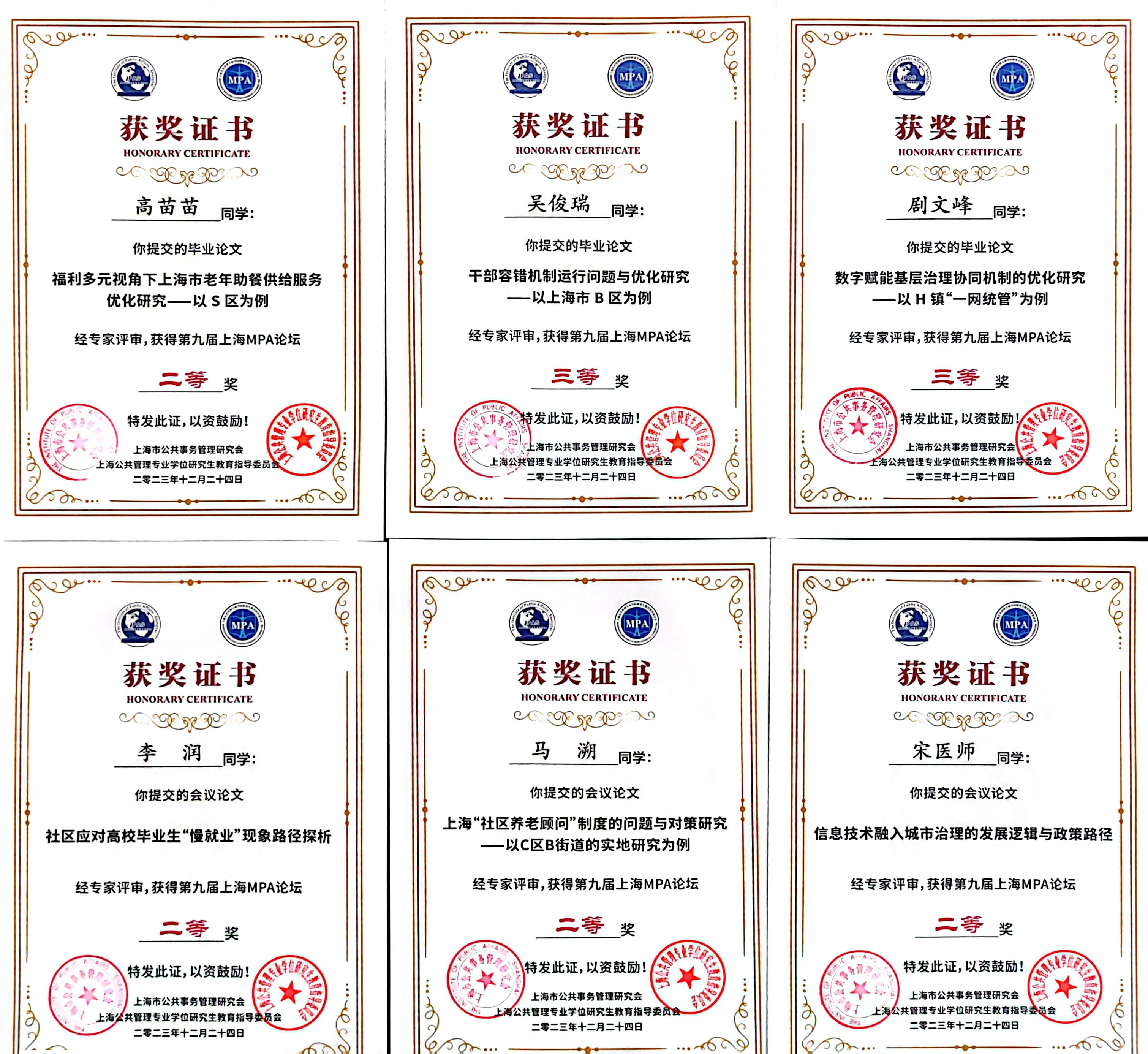 本次论坛经过专家严格的匿名评审和会审,我校选送的《福利多元视角下上海市老年助餐供给服务优化研究——以S区为例》(高苗苗撰写,唐珏岚指导)获得优秀毕业论文二等奖;《干部容错机制运行问题与优化研究——以上海市B区为例》(吴俊瑞撰写,袁峰指导)和《数字赋能基层治理协同机制的优化研究——以H镇“一网统管”为例》(剧文峰撰写,董幼鸿指导)获得优秀毕业论文三等奖;《社区应对高校毕业生“慢就业”现象路径探析》(李润撰写,袁峰指导)、《上海“社区养老顾问”制度的问题与对策研究——以C区B街道的实地研究为例》(马溯撰写,马立指导)、《信息技术融入城市治理的发展逻辑与政策路径》(宋医师撰写,袁峰指导)获得优秀会议论文二等奖。