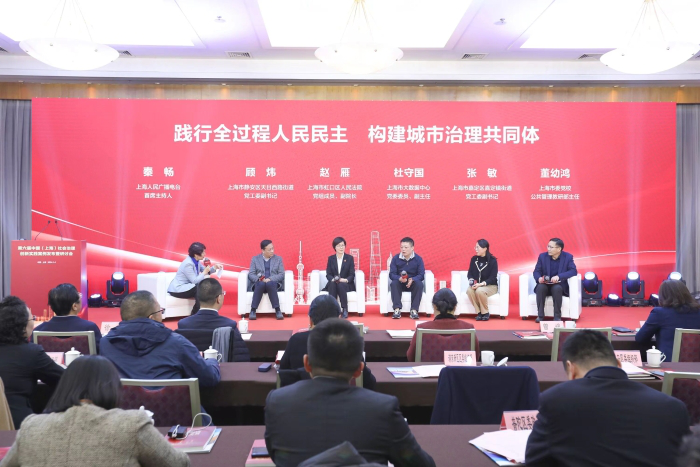 在圆桌论坛环节,静安区天目西路街道党工委副书记顾炜,虹口区人民法院党组成员、副院长赵雁,上海市大数据中心党委委员、副主任杜守国,嘉定区嘉定镇街道党工委副书记张敏,上海市委党校公共管理教研部主任董幼鸿教授,分别就“践行全过程人民民主,构建城市治理共同体”共商共议。