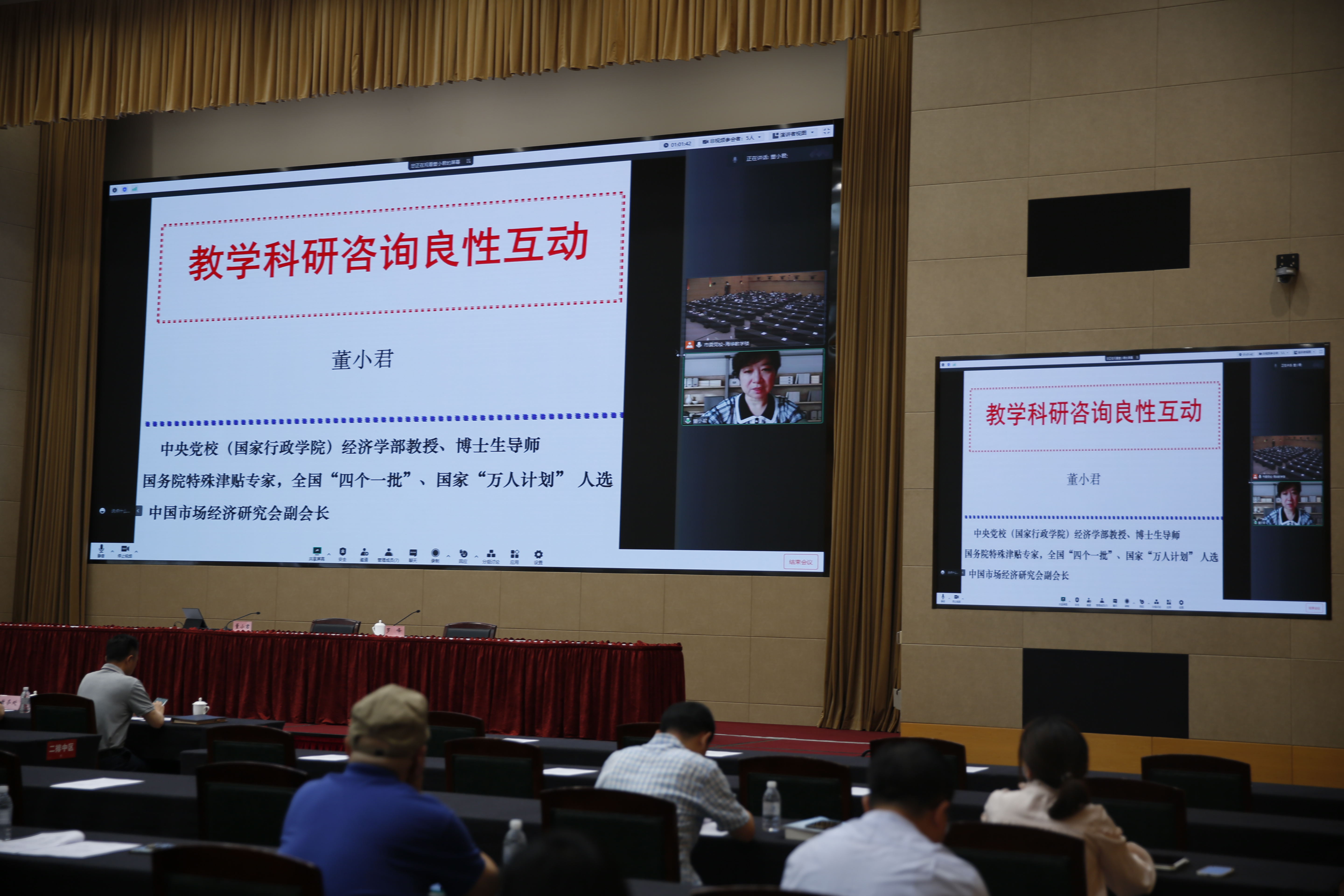 本网讯 为深入推进党校教研咨一体化工作,5月16日上午,校(院)特邀中央党校经济学教研部副主任董小君教授为全体教师作线上专题报告,主题为“教学、科研、咨询良性互动”。教育长罗峰主持报告会。