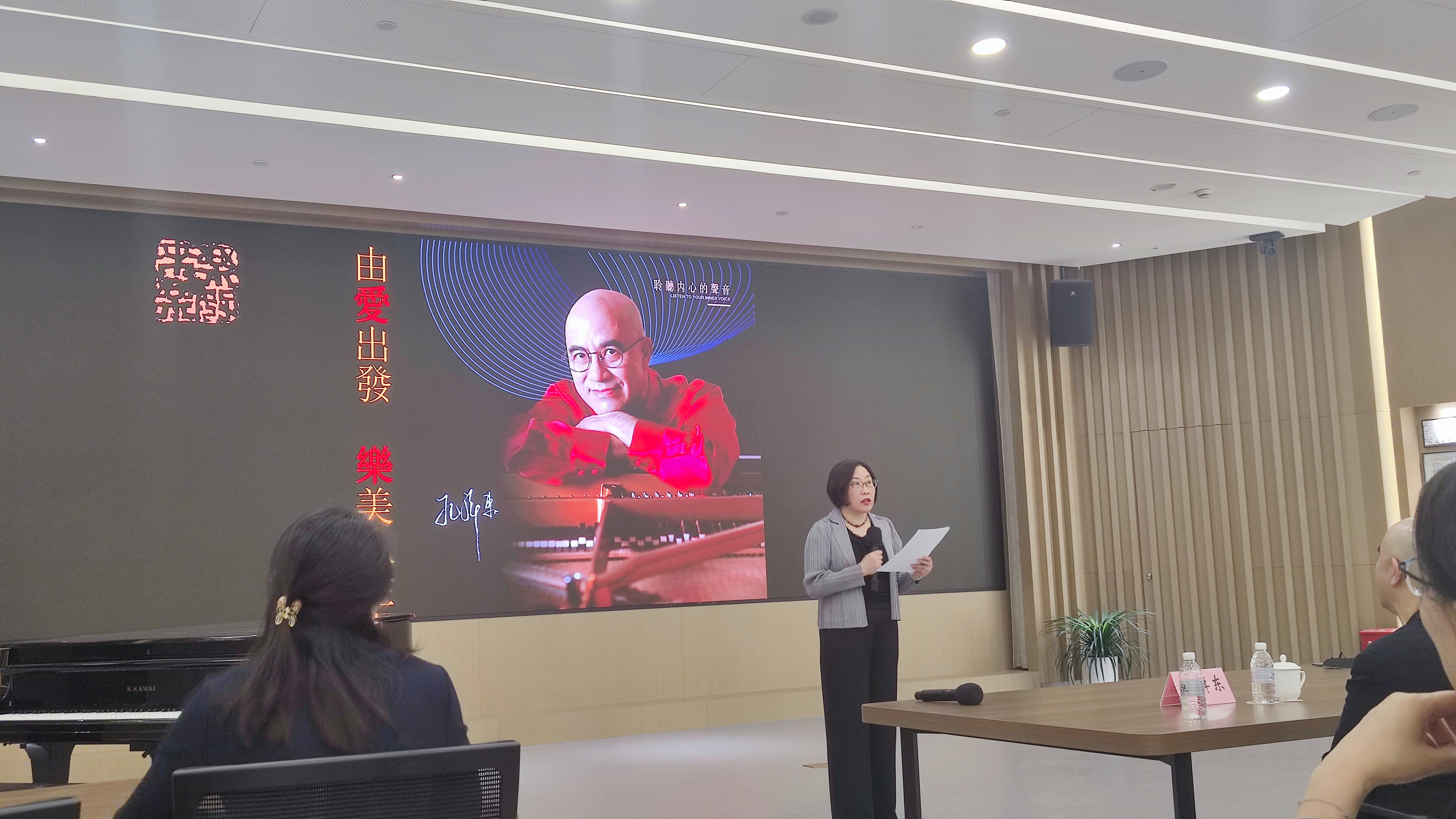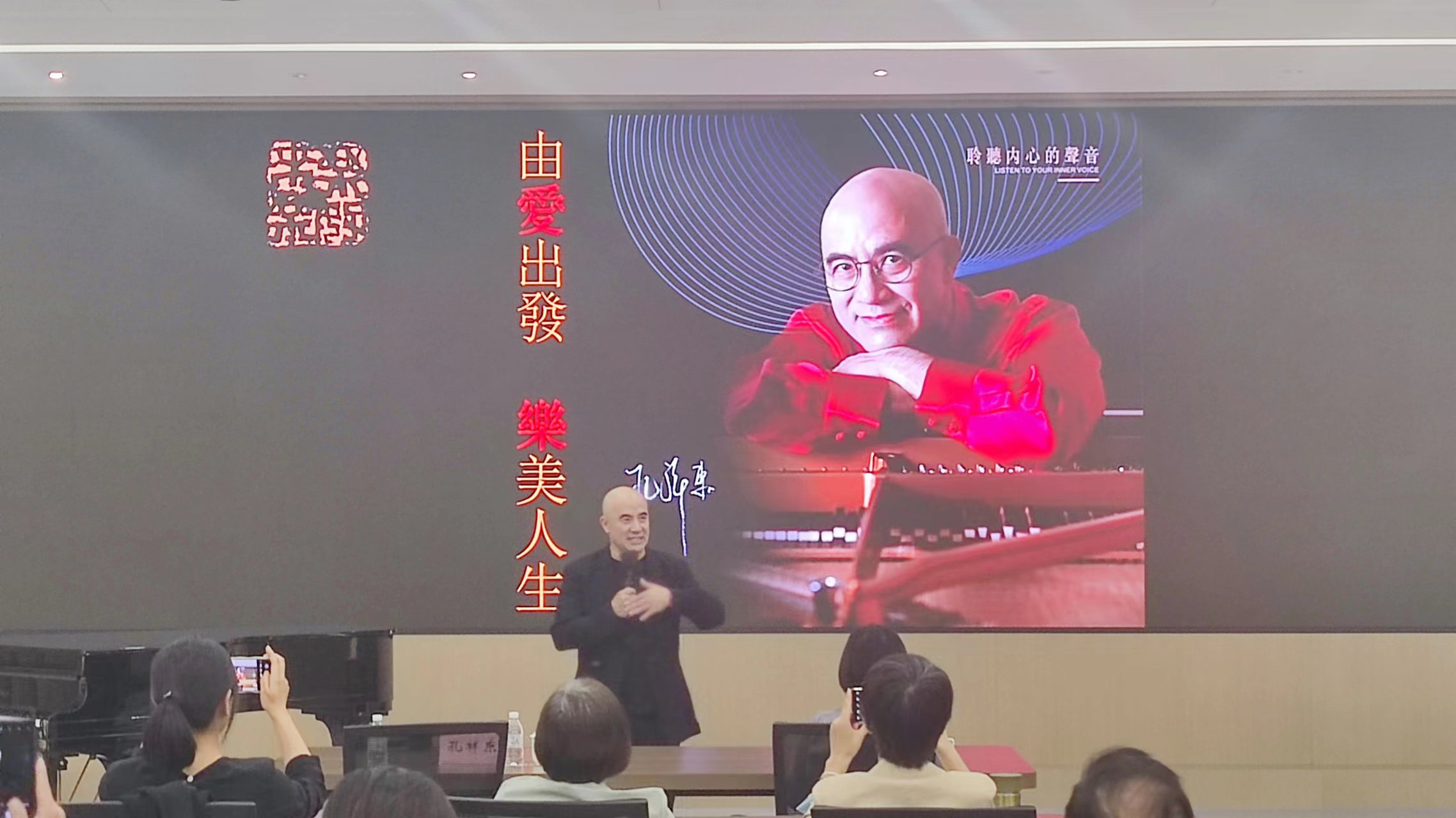 讲座中,孔祥东先生以中国文字“乐”为切入点,谈到音乐本身的力量——“爱由心生,方有音乐”“音乐是灵魂的语言”,音乐更是“每个人心灵唯一的创可贴”。结合自己的个人经历和近年来参与的公益活动和演出故事,孔祥东先生提出,音乐作为人类生活中情绪表达的载体,可以记录人在不同生命阶段的回忆,疗愈人在人生路上受过的创伤,更可以给处在困境的人带来力量。