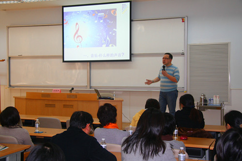 宗晓军教授从“什么是音乐”开始,带领大家一起进入音乐世界遨游。“音乐是由什么组成的?音乐的起源是什么?”讲座中,宗老师播放了10多首音乐大师的钢琴曲、提琴曲等作品,引导大家一步步了解音乐的音高、音色和节奏,切实感受到声音的高度、颜色和韵率,逐渐理解音乐大师们对生活、对大自然、对世界的的丰富性情感。宗老师通过音乐使大家不仅获得感性体验,而且增强了对音乐的理性认识,进而培养大家良好的音乐审美情感。同时宗老师用通俗的语言,深入浅出地向大家介绍了古典音乐的历史,博得全场热烈的掌声。