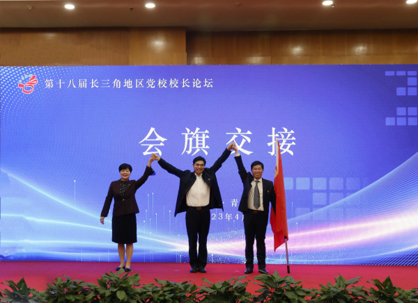 青浦区委党校常务副校长陈菊英与第十九届长三角地区党校校长论坛承办单位无锡市滨湖区委党校常务副校长董盛雄进行了会旗交接,董盛雄作表态发言。