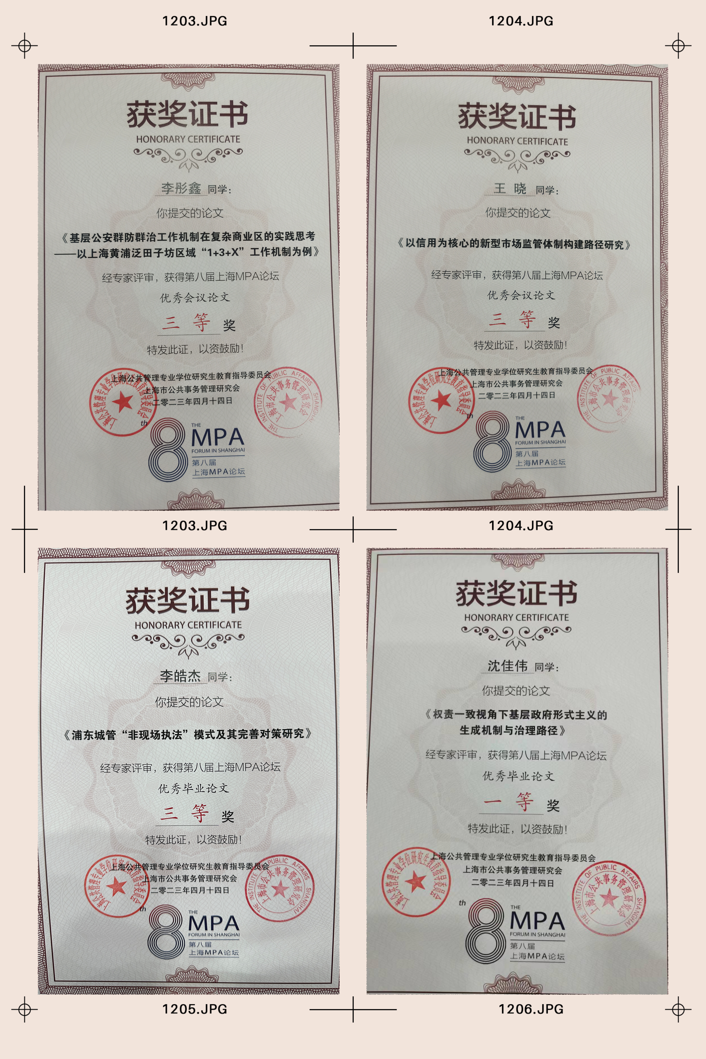 本次论坛经过专家严格的匿名评审和会审,我校选送的《权责一致视角下基层政府形式主义的生成机制与治理路径》(沈佳伟撰写,袁峰指导)获得毕业论文一等奖;《浦东城管“非现场执法”模式及其完善对策研究》(李皓杰撰写,蔡爱平指导)获得毕业论文三等奖;《以信用为核心的新型市场监管体制构建路径研究》(王晓撰写,陈煜婷指导)和《基层公安群防群治工作机制在复杂商业区的实践思考 ——以上海黄浦泛田子坊区域“1+3+X”工作机制为例》(李彤鑫撰写)获得会议论文三等奖。这是我校连续第三年斩获上海市MPA论坛毕业论文一等奖。