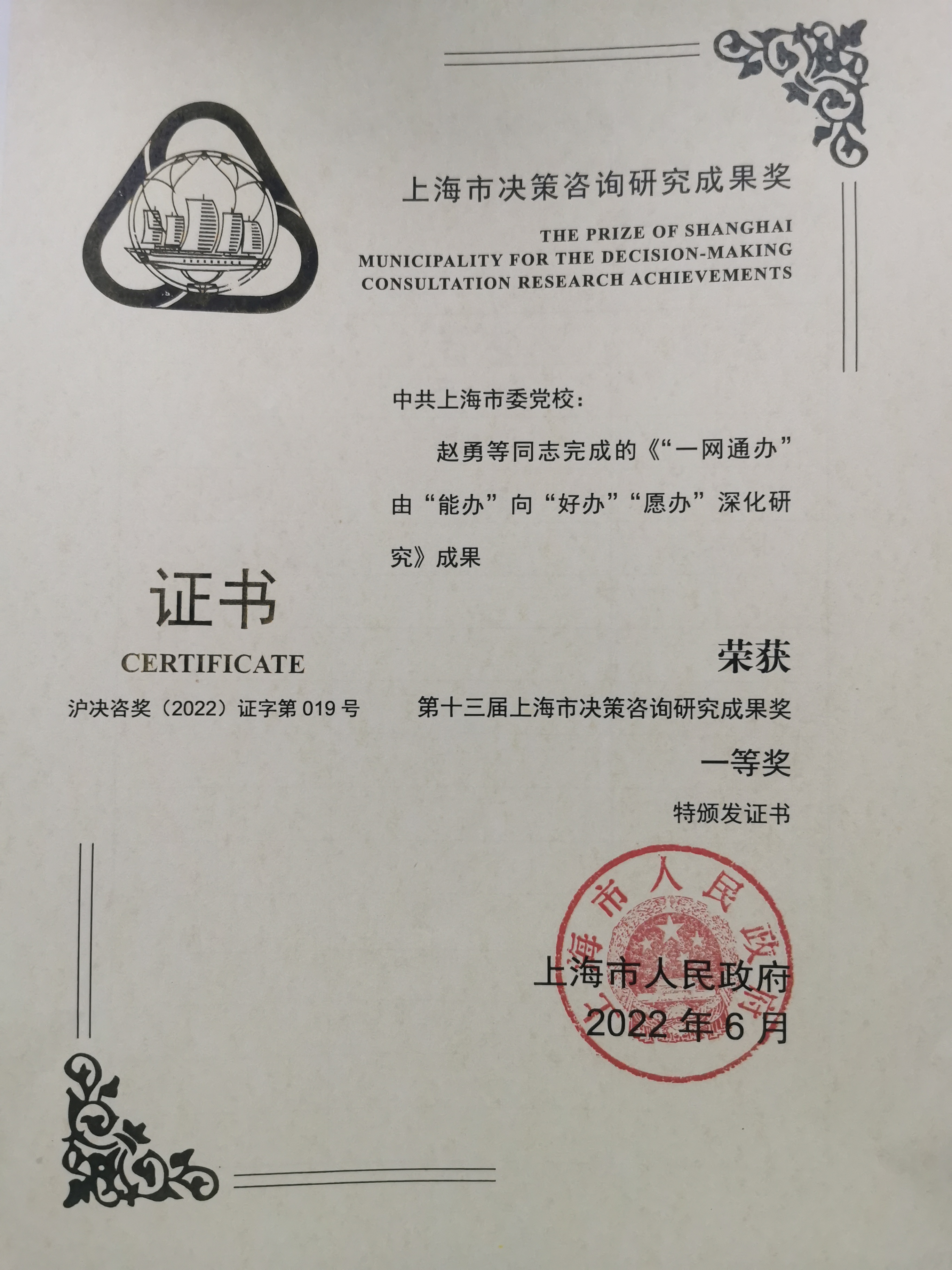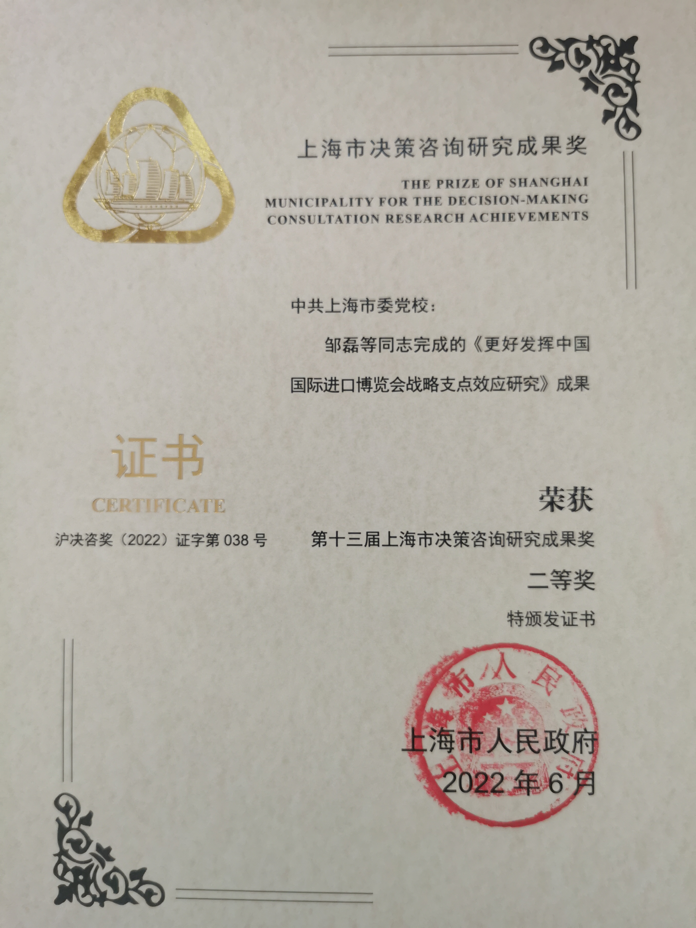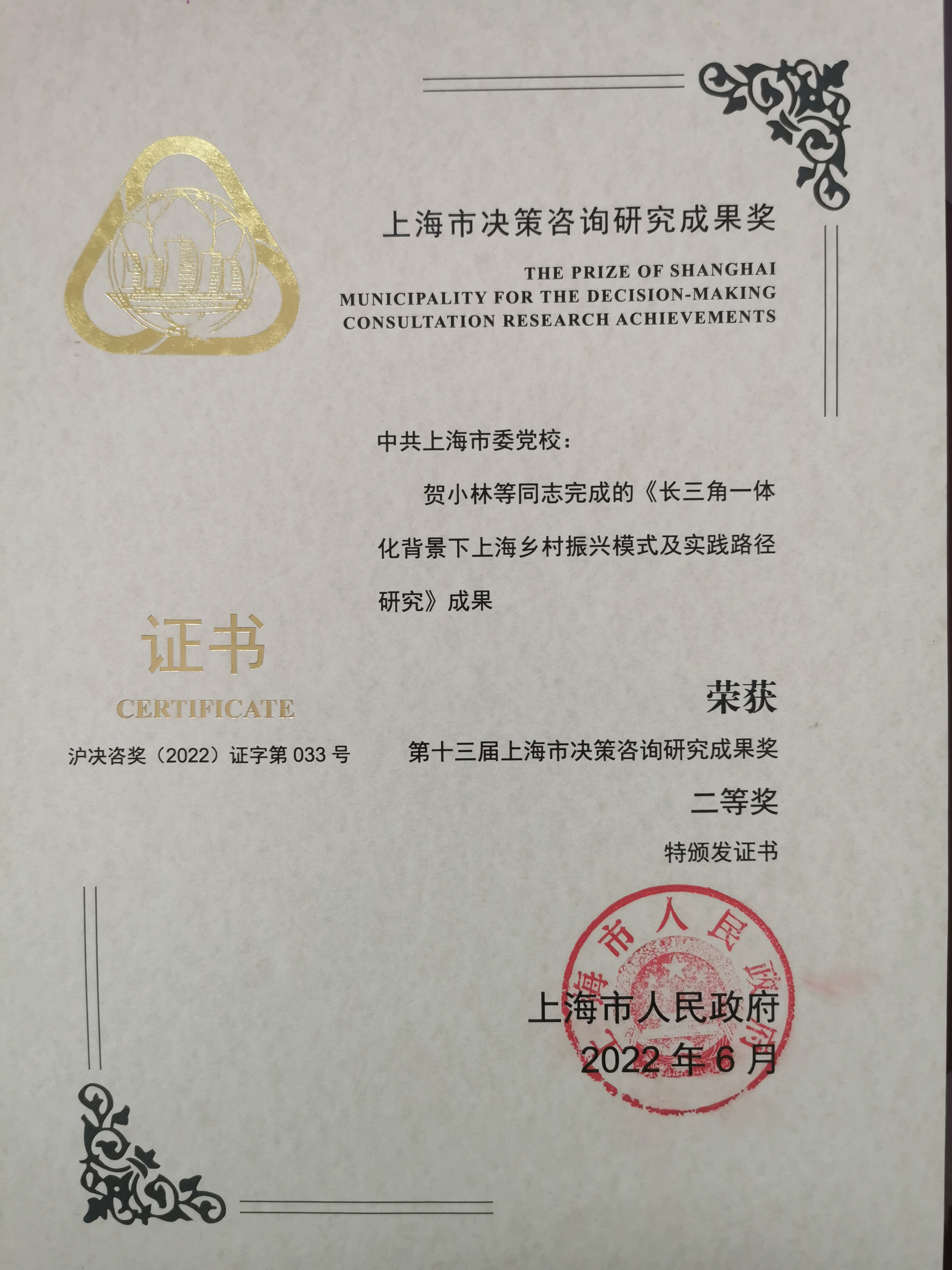 本网讯 11月24日上午,2022年上海市政府决策咨询工作会议在市政府召开,上海市委副书记、市长龚正出席会议并讲话,上海市委常委、常务副市长吴清主持会议。会议表彰了获得第十三届上海市决策咨询研究成果奖获奖人员和团队,其中一等奖19项、二等奖41项、三等奖20项。我校(院)赵勇教授主持的成果获得一等奖,填补了校(院)上海市决策咨询研究成果奖一等奖的空白。贺小林副教授和邹磊副研究员主持的成果获得二等奖。