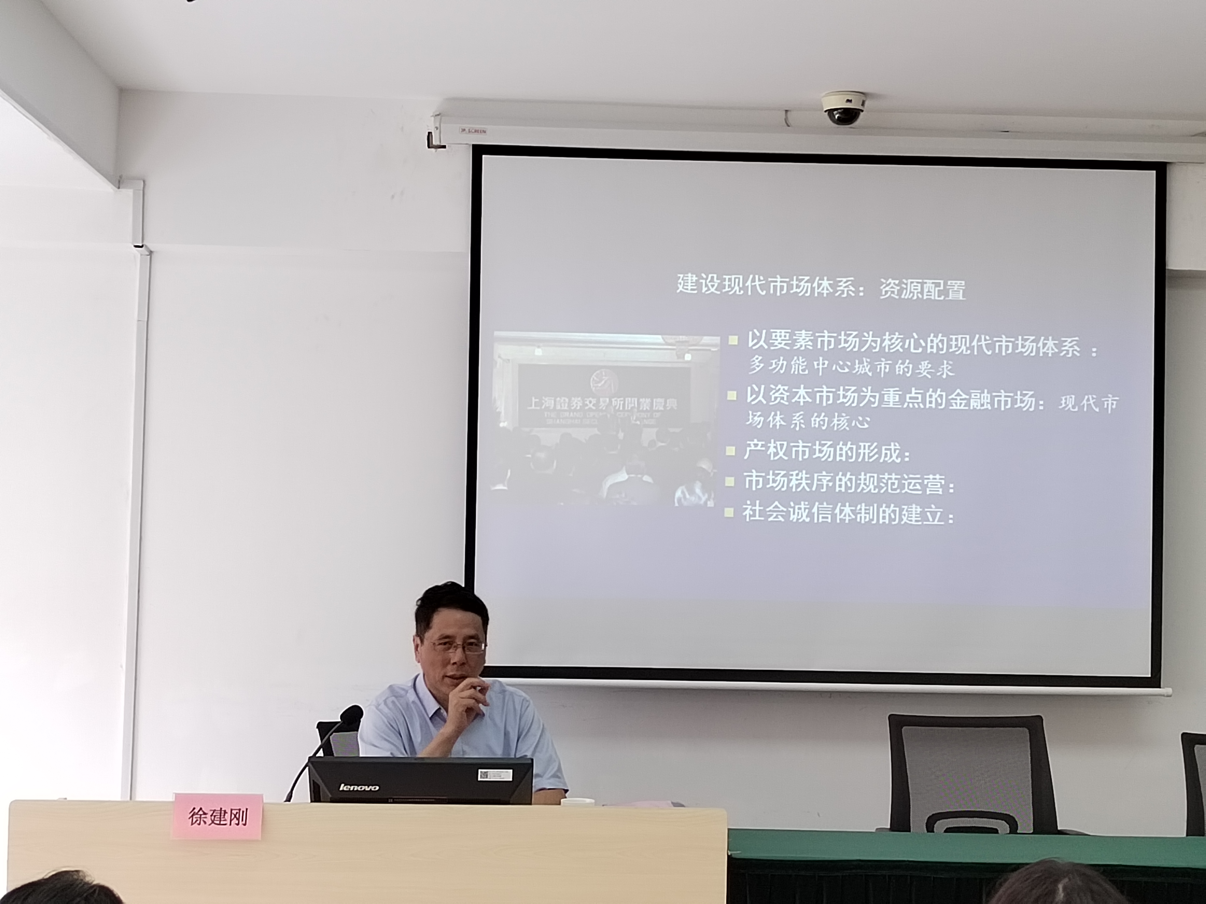 授课中,徐建刚紧紧围绕“四个放在”,从国际形势的变化、国家战略的演进、上海的发展形态这三个重要维度详细讲述了上海在不同历史时期的具体面貌,重点介绍了上海城市功能的定位与发展战略、产业结构与城市空间的变化及上海人民生活的变迁。他选取1956年、1990年、2012年、2022年这四个重要时间节点,回顾了中央对上海的战略定位——从“中国的重要工业基础和财政支柱”到“社会主义现代化的中心城市”“社会主义现代化国际大都市”,再到“具有世界影响力的社会主义现代化国际大都市”,中央是如何一步步引领着上海从工商城市成功转型为工业中心城市、多功能中心城市,直至当前国际大都市的光辉奋斗历程。他运用上海国民经济增长率、产业结构占比、发展速度等相关经济指标的历年数据比较图表和多张上海历史老照片,生动而直观地展示了上海在党中央的坚强领导下奋斗发展的鲜活图景。