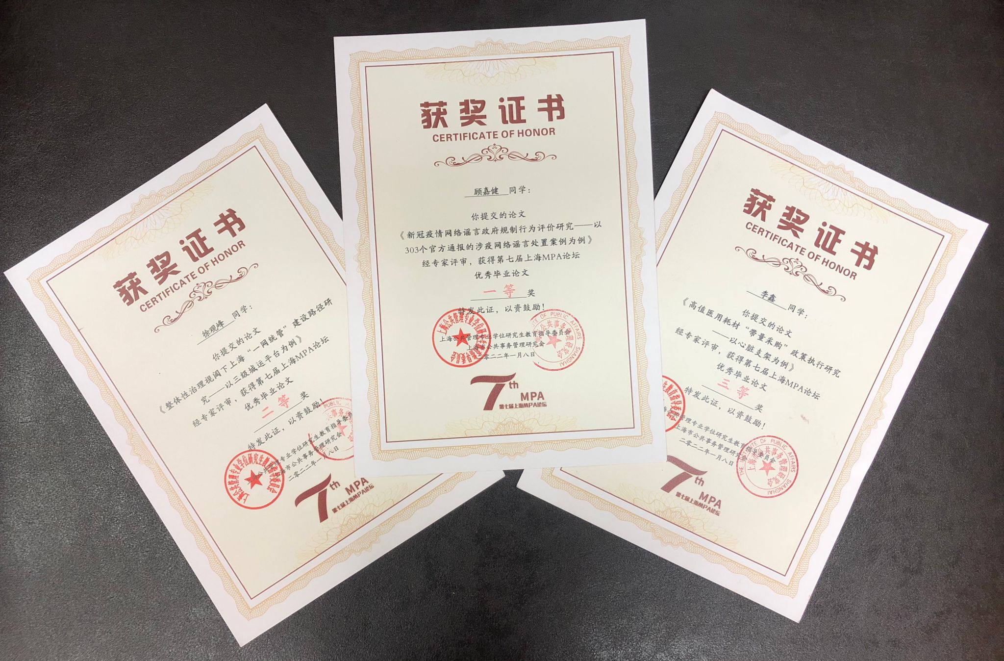 本次论坛共收到来自上海MPA培养院校的67篇毕业论文和36篇会议论文,经过专家严格的匿名评审和会审,我校选送的三篇毕业论文全部获奖,分别为陈保中教授指导、李鑫撰写的《高值医用耗材“带量采购”政策执行研究——以心脏支架为例》获优秀毕业论文三等奖;董幼鸿教授指导、徐观峰撰写的《整体性治理视阈下上海“一网统管”建设路径研究——以三级城运平台为例》获优秀毕业论文二等奖;上官酒瑞指导、顾嘉健撰写的《新冠疫情网络谣言政府规制行为评价研究——以303个官方通报的涉疫网络谣言处置案例为例》以总分第一获得优秀毕业论文一等奖。我校虽然在校生规模较小,但人均获奖成果和奖项水平均名列前茅,学校MPA的培养质量得到与会同行和专家的充分肯定。