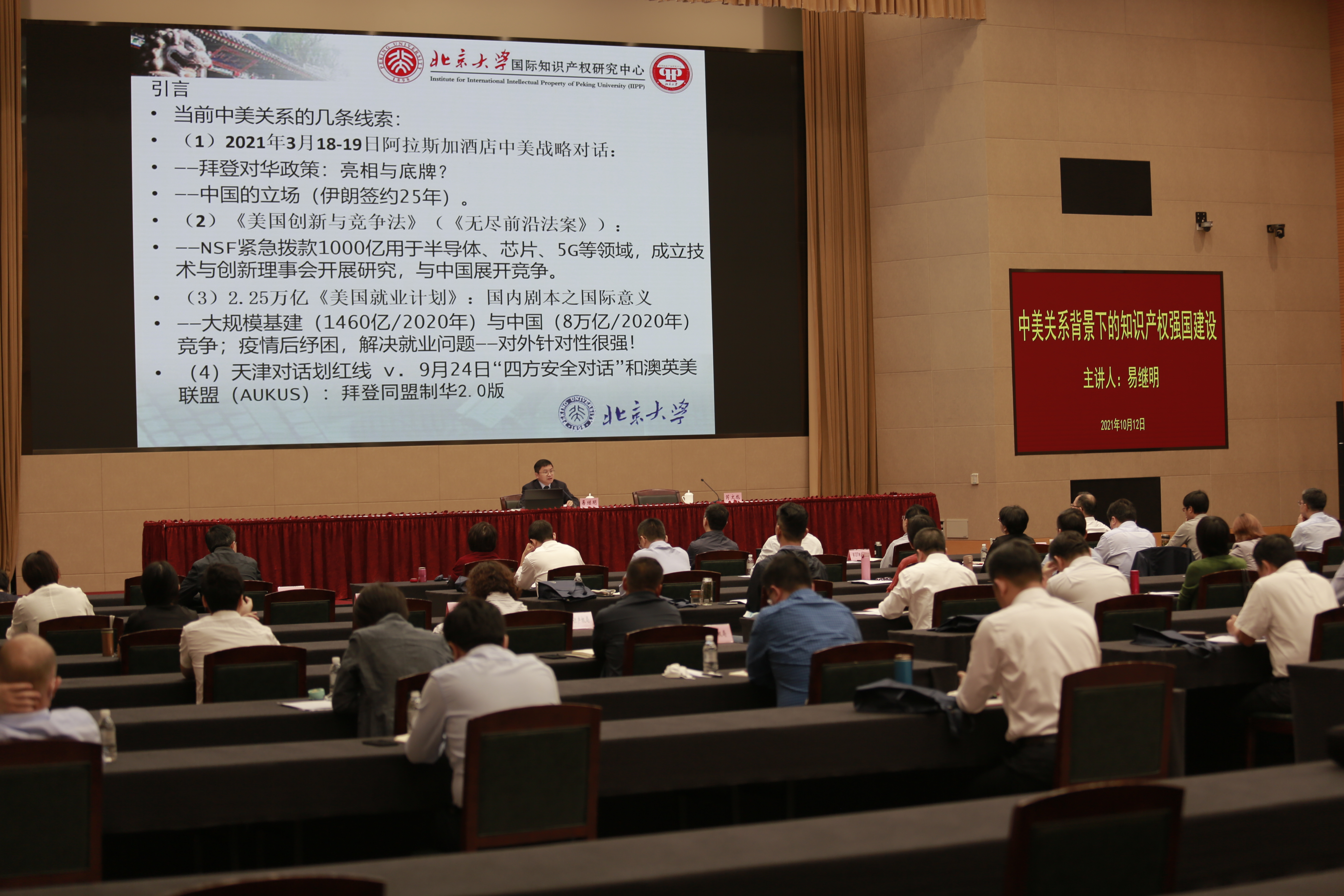 本网讯 10月12日上午,北京大学法学院教授、北京大学国际知识产权研究中心主任易继明教授应邀为我校第127期领导干部进修班作题为“中美关系背景下的知识产权强国建设”专题授课。市知识产权局党组书记、局长芮文彪主持。