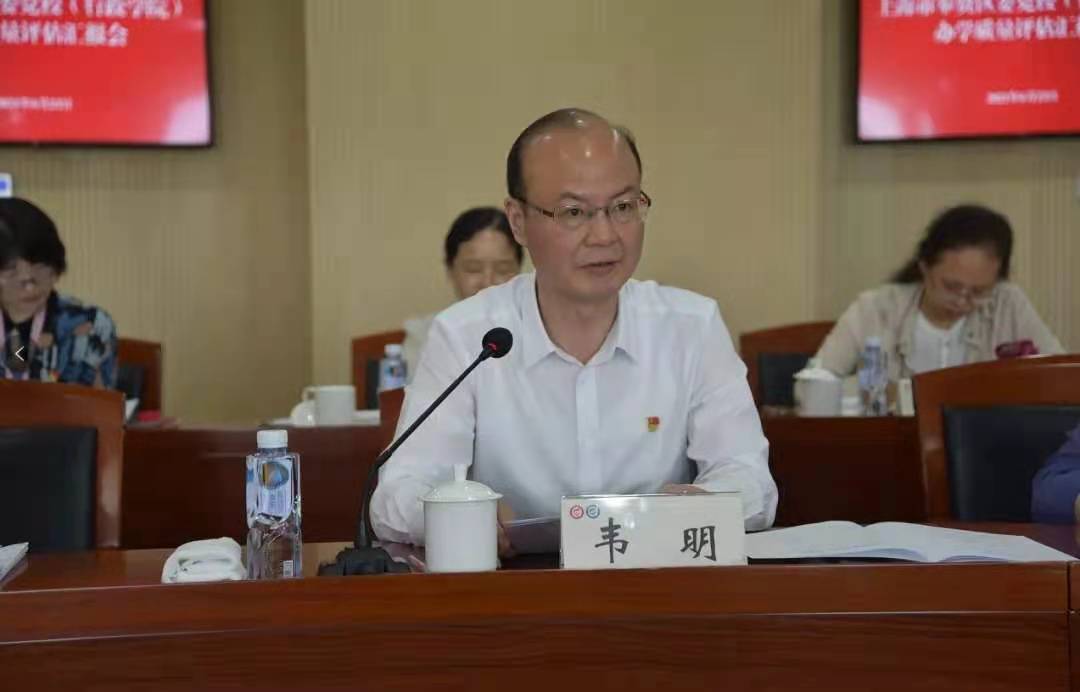 韦明向市委组织部、市委党校(行政学院)评估工作组的到来表示欢迎和感谢,并以“奉信、奉贤、奉献,在坚持党校姓党中砥砺前行”为题,从“坚持正确办学方向”“创新培训模式”“深化教学改革”“强化科研基础”“加强自身建设”五方面,对五年来奉贤区委党校(行政学院)的工作情况进行了自评汇报。