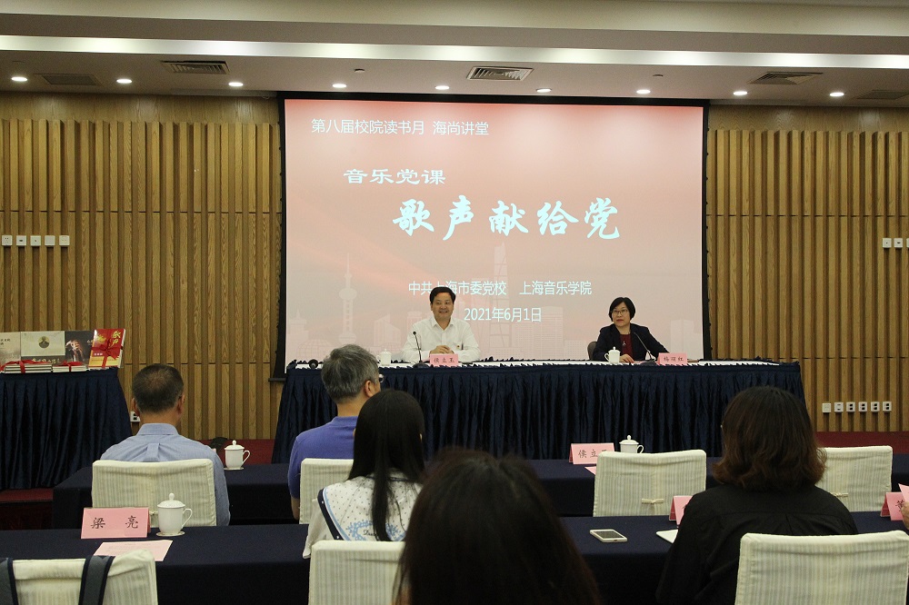 本网讯 6月1日上午,为迎接中国共产党建党100周年、学习传唱红色经典歌曲,第八届校院读书月活动海尚讲堂——“歌声献给党”音乐党课在市委党校举行。本次活动由市委党校和上海音乐学院主办,市委党校图书馆、上海音乐学院出版社承办。市委党校副校长梅丽红、上海音乐学院副院长侯立玉分别致辞。活动由校研究生部主任袁峰主持。校党群工作部、外事处、图书馆、研究生部、校刊编辑部等5个党支部全体党员和入党积极分子,校合唱团、在校研究生,上海音乐学院“歌声献给党”系列图书作者及出版社党支部党员共百余人参加。