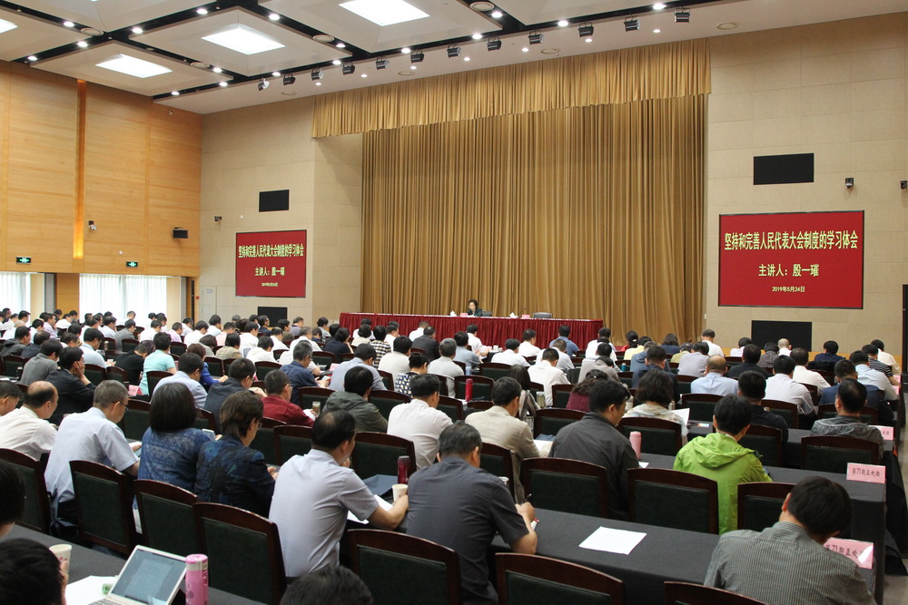 本网讯 5月24日,市人大常委会主任殷一璀出席新时代讲坛,作主题为“坚持和完善人民代表大会制度的学习体会”辅导报告。常务副校院长沈炜主持。