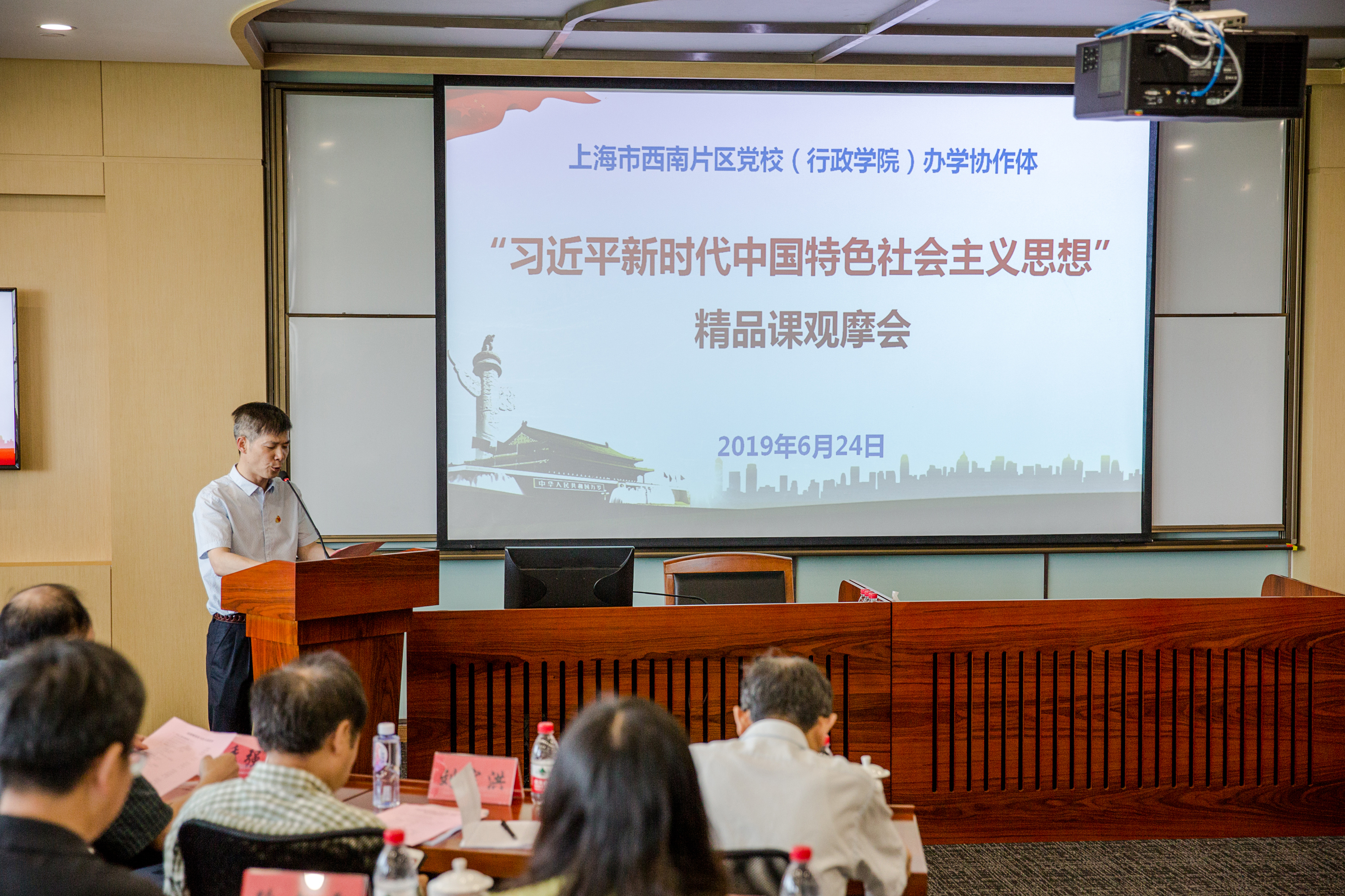 本网讯 6月24日下午,上海市西南片区党校(行政学院)办学协作体“习近平新时代中国特色社会主义思想”精品课观摩会在奉贤党校举行。市委党校校院工作处处长任锴荣、教学督导组组长吕会霖、马克思主义学院教授袁秉达、党史党建教研部教授刘宗洪出席观摩会,会议由奉贤区委党校副校长王东辉主持。