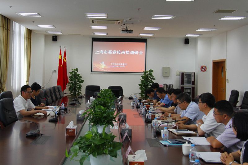 与会人员观看了松江党校《让党旗在党校上空高高飘扬》宣传片,并就教学、科研、行政管理等方面进行了深入的互动交流。