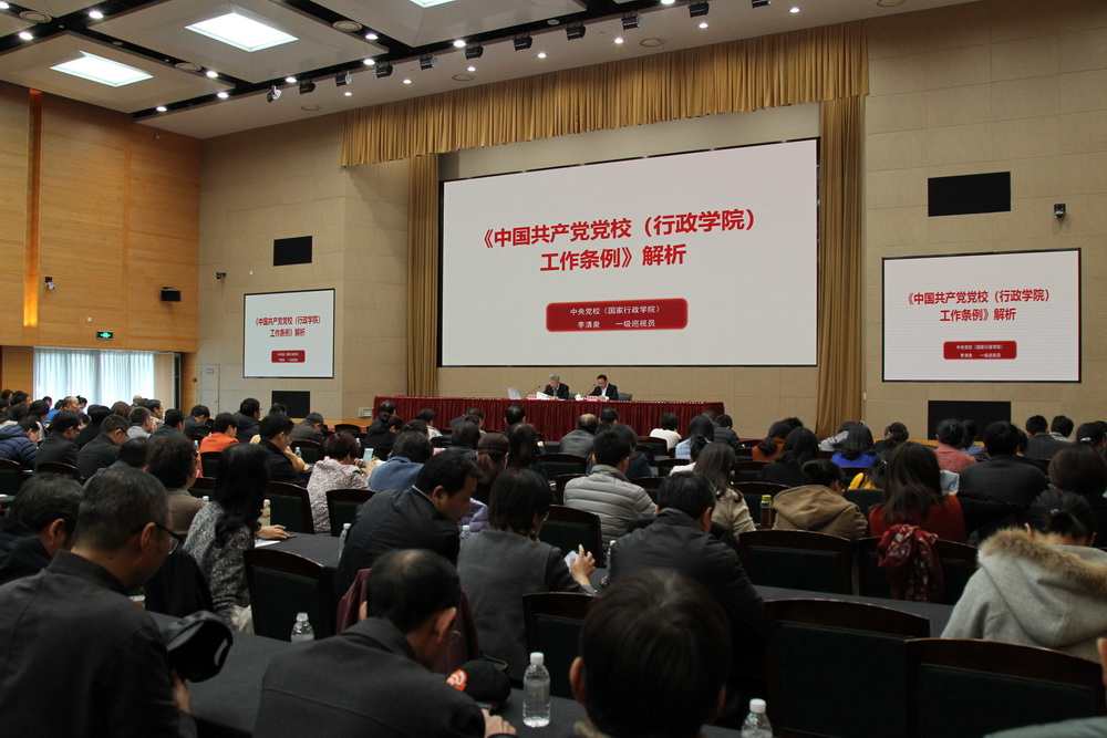 李清泉从《条例》起草背景和总体思路、起草过程、总体框架和各部分亮点、需要深入把握的主要内容和如何贯彻落实五个方面进行了详细阐述。重点解读“八个深入把握”即深入把握办学的指导思想、深入把握工作的职责定位、深入把握教育培训的重中之重、深入把握党校姓党的根本原则、深入把握从严治校的基本要求、深入把握质量立校的重要遵循、深入把握教学科研管理等各方面的规范性要求、深入把握解决重点难点问题的创新思路和措施。明确了贯彻落实《条例》的重点:一是各级党校(行政学院)要配合组织好同级党委(党组)理论学习中心组的学习工作;二是要把《条例》纳入校(院)委会理论学习中心组学习内容,组织好专题学习培训,对照《条例》固根基、扬优势、补短板、强弱项;三是抓好《条例》督促指导工作。