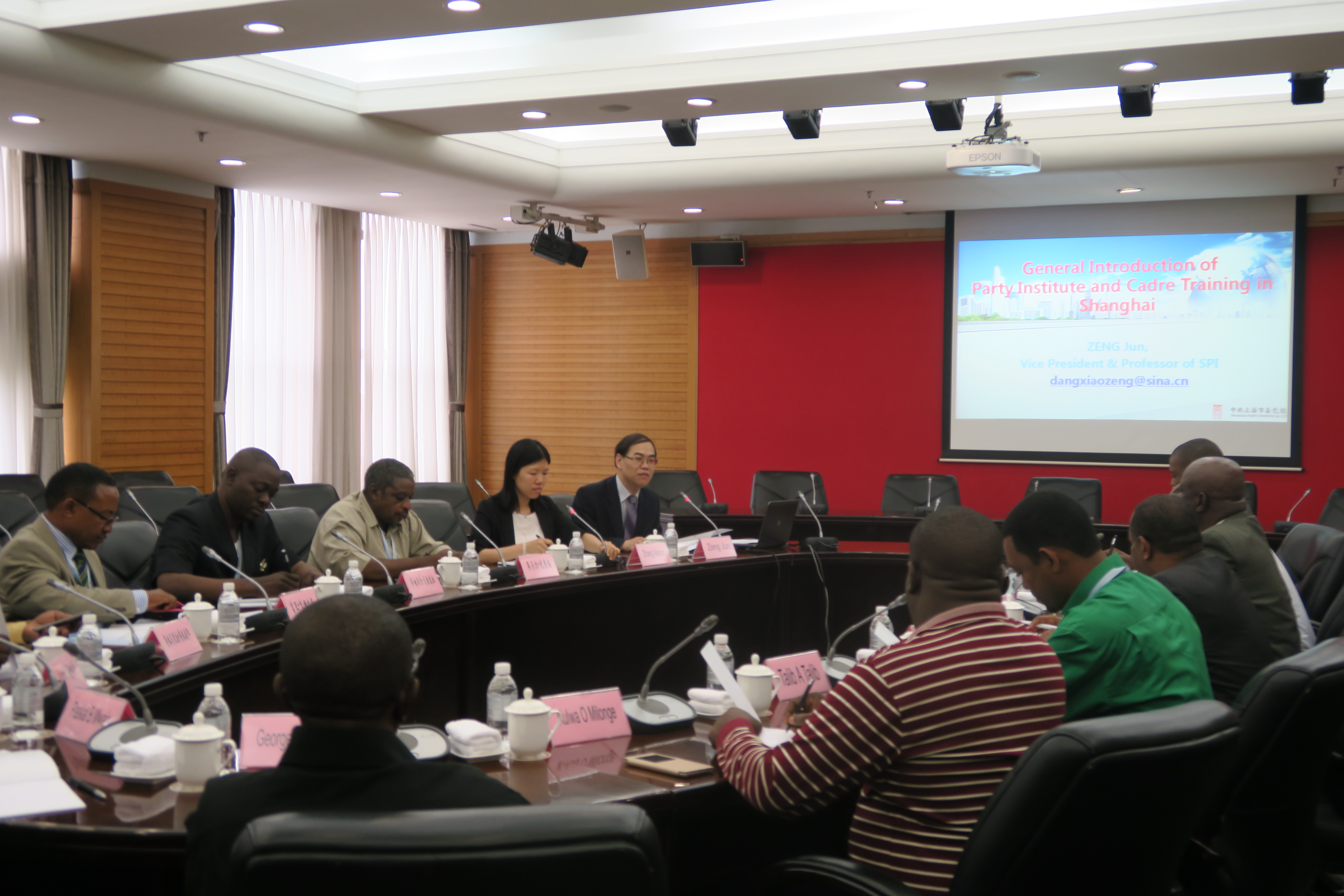 中共上海市委党校常务副校长沈炜热情会见研修班成员并发表欢迎致辞。沈炜在致辞中表示,此次举办坦桑尼亚革命党全国执委研修班适逢中国“一带一路”国际合作高峰论坛的召开,习近平主席在论坛上提出了“和平合作、开放包容、互学互鉴、互利共赢”为核心的丝路精神,在此背景下革命党执委来沪研修,双方互学互鉴,意义非凡;希望考察团成员能通过上海这个窗口,了解中国共产党在政治、经济、社会、文化、生态建设方面的伟大实践,感受中国和上海改革开放取得的巨大成就。研修班团长、坦桑尼亚革命党中央委员、中央书记处组织书记佩雷拉·西利马在致辞中说:“感谢中国政府和人民为坦桑尼亚提供的合作和帮助,中国共产党在经济建设和社会发展方面取得了举世瞩目的成就,我和同事来到中国、来到上海,就是想了解并学习中国共产党领导经济社会发展和政党建设方面的经验,相信在上海的讨论和交流一定十分精彩!”
