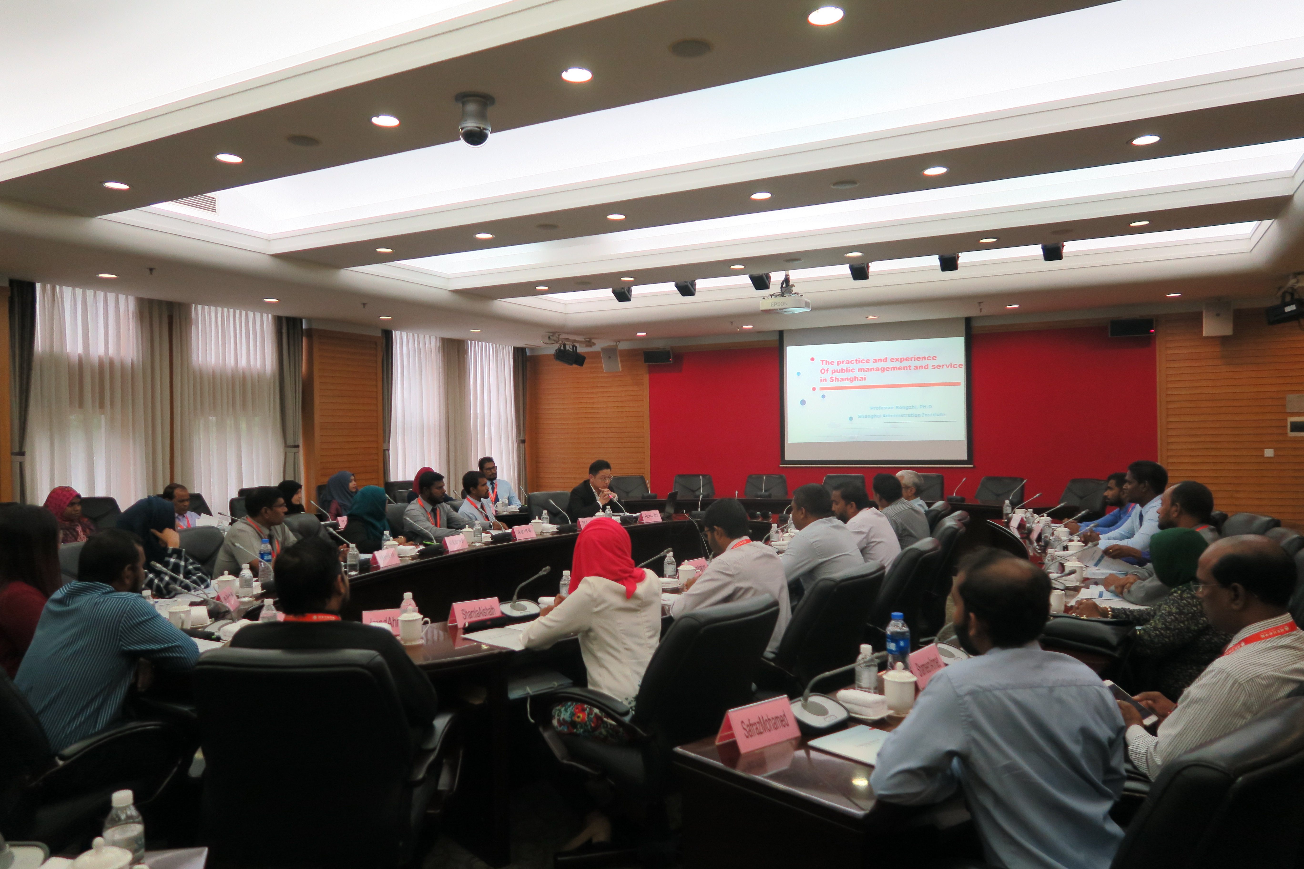 当日上午,教育长梅丽红热情会见研修班成员,并与学员合影留念。外事处、培训处负责人陪同会见。公共管理教研部容志教授为学员英文讲授“上海公共管理与公共服务的做法与经验”课程,学员就中国知识产权保护的现状、中国(上海)自由贸易试验区的运营方式及投资渠道、上海政府的外来人口管理、境外人士来沪政策等问题与老师积极展开互动交流,讨论提问气氛热烈。