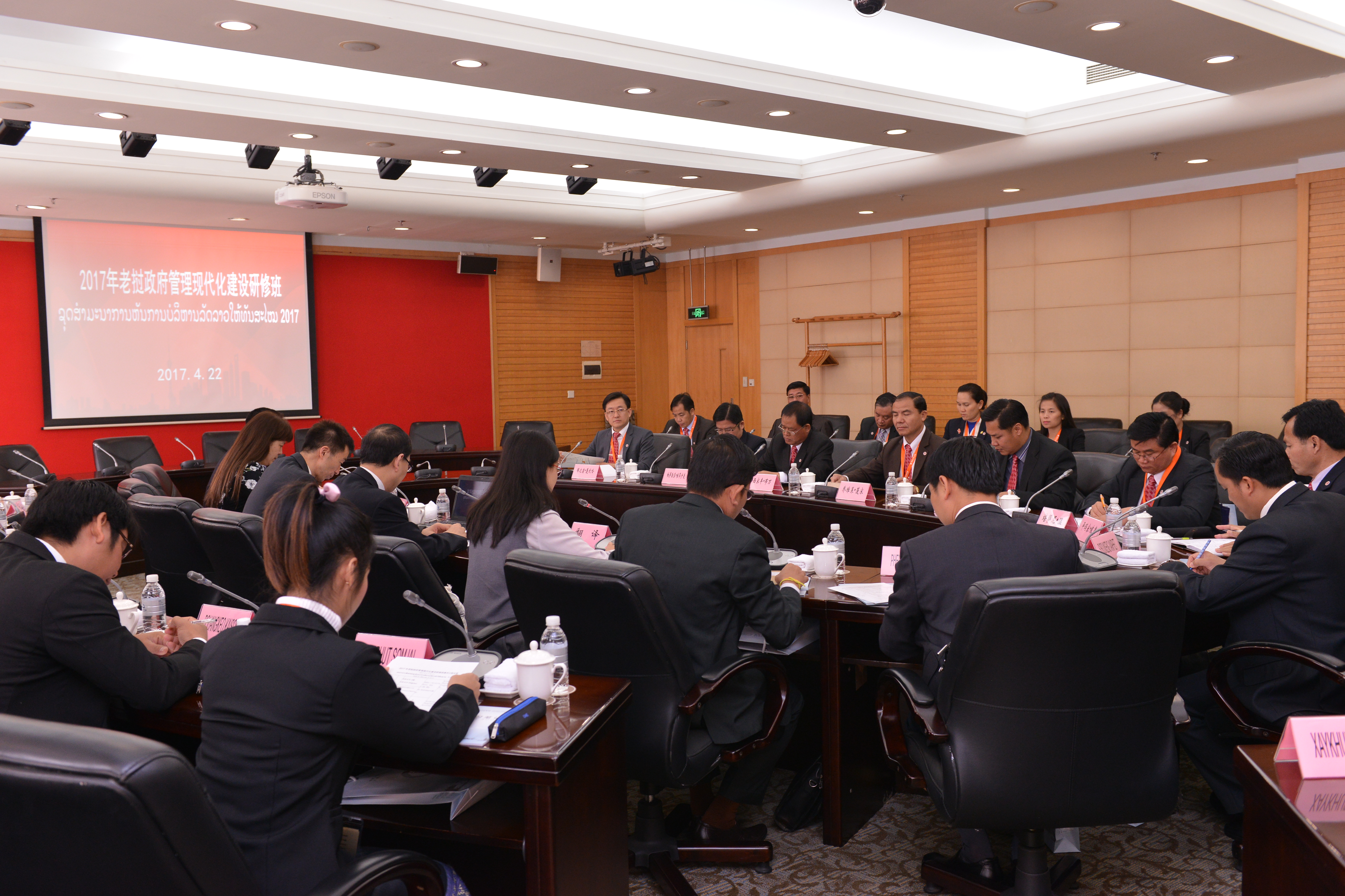 本网讯 4月22日,受国家行政学院培训中心委托,2017年老挝政府管理现代化建设研修班来我院研修。该班学员由来自老挝计划投资部、总理府、外交部等中央和地方政府的27位司处级公务员组成。国家行政学院培训中心副主任刘钢随班访问我院。