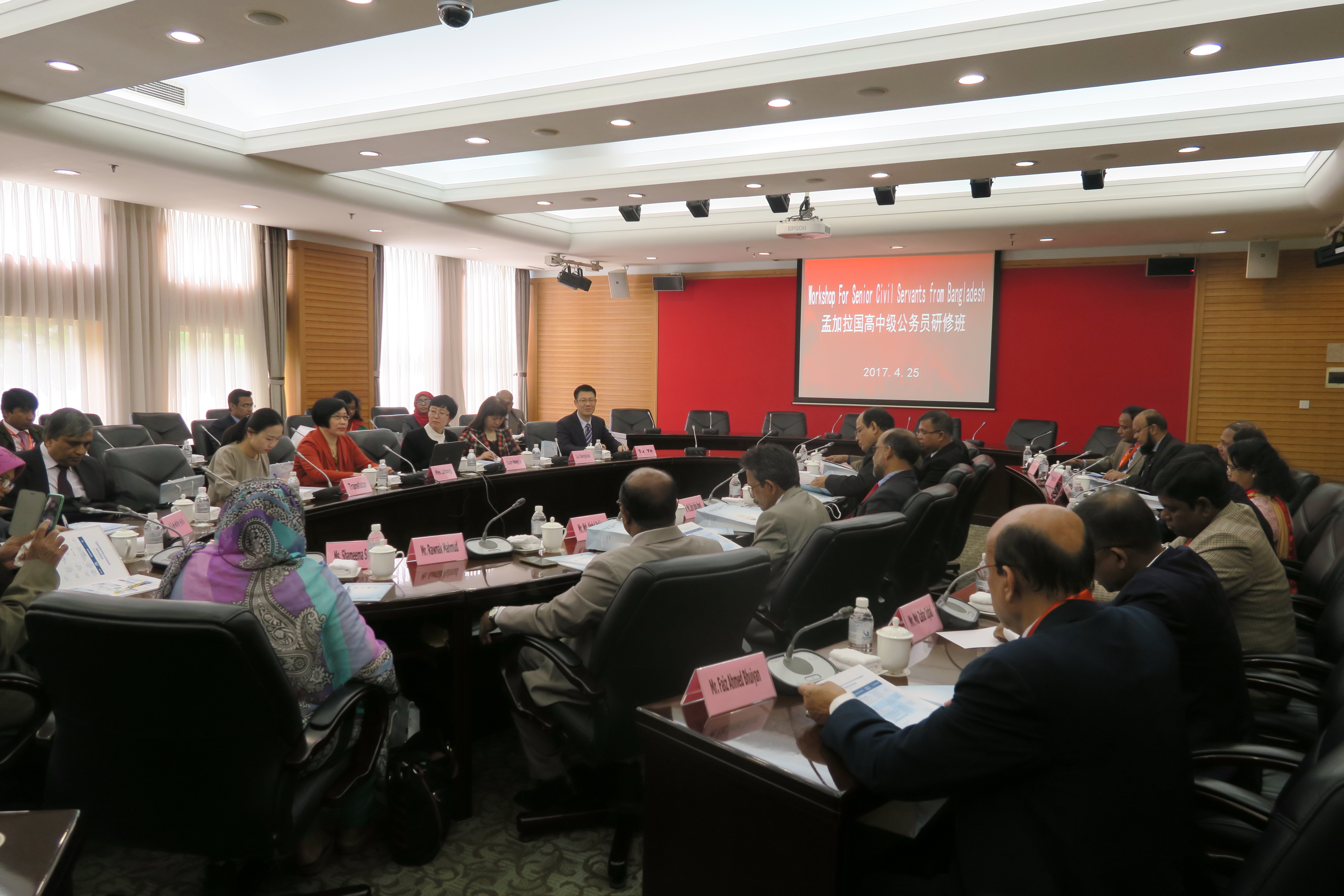 本网讯 4月24-25日,受国家行政学院培训中心委托,孟加拉国高中级公务员研修班来我院研修。该班学员由来自孟加拉国公共管理部、国土部、食品部、国防部等各部门的24名高中级官员组成,其中20位副部级,4位司处级官员。国家行政学院培训中心副主任段红霞随班访问我院。