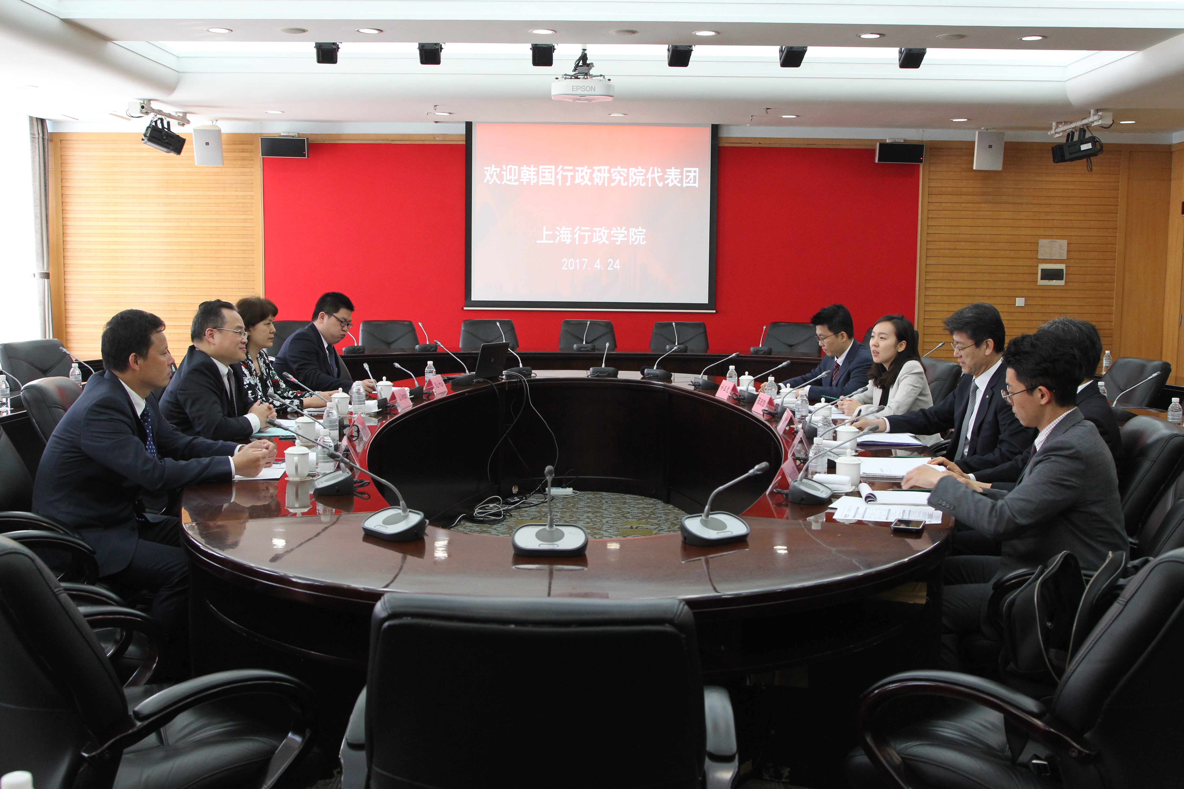 本网讯 4月24日上午,韩国行政研究院代表团一行5人在郑允秀院长的带领下,来访上海行政学院,副院长郭庆松主持会见。