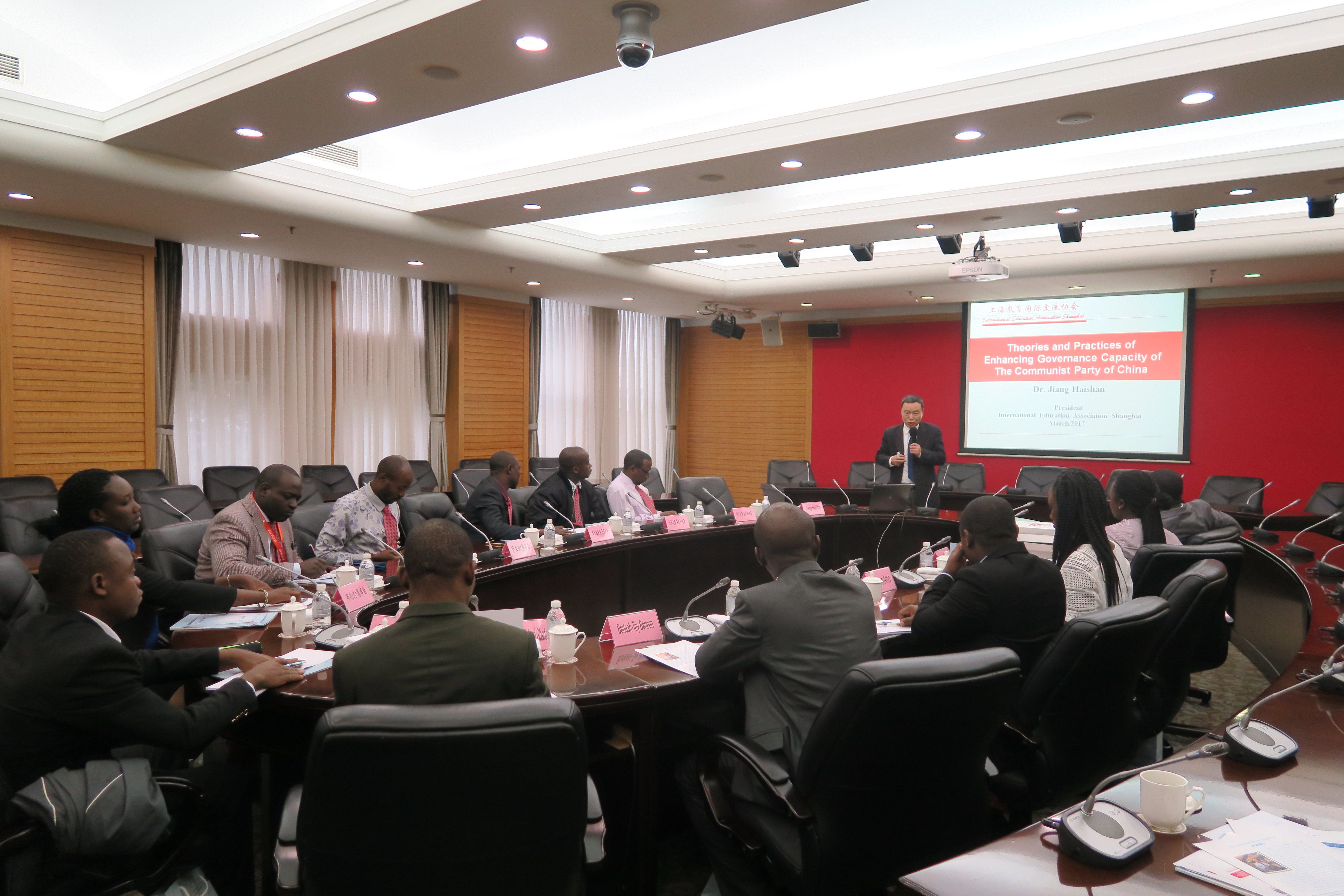 当日上午,教育长梅丽红热情会见研修班成员,并与学员合影留念。外事处、培训处负责人陪同会见。培训班特邀原中国浦东干部学院副院长姜海山为学员英文讲授“中国共产党加强执政能力建设的理论和实践”课程,从中国共产党加强执政能力建设的原因、主要内容和任务以及历史经验等方面展开,与学员进行了深入的交流讨论。