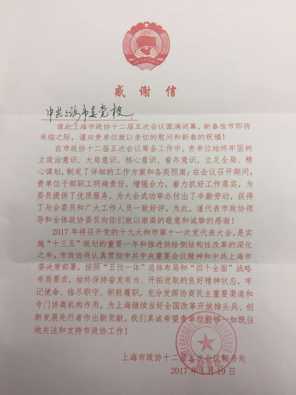 本网讯 1月18日,上海市政协委员会十二届五次会议秘书处发来感谢信,对校院圆满完成市政协十二届五次会议的各项服务保障工作给予表彰,对校院全体工作人员表示衷心的感谢。