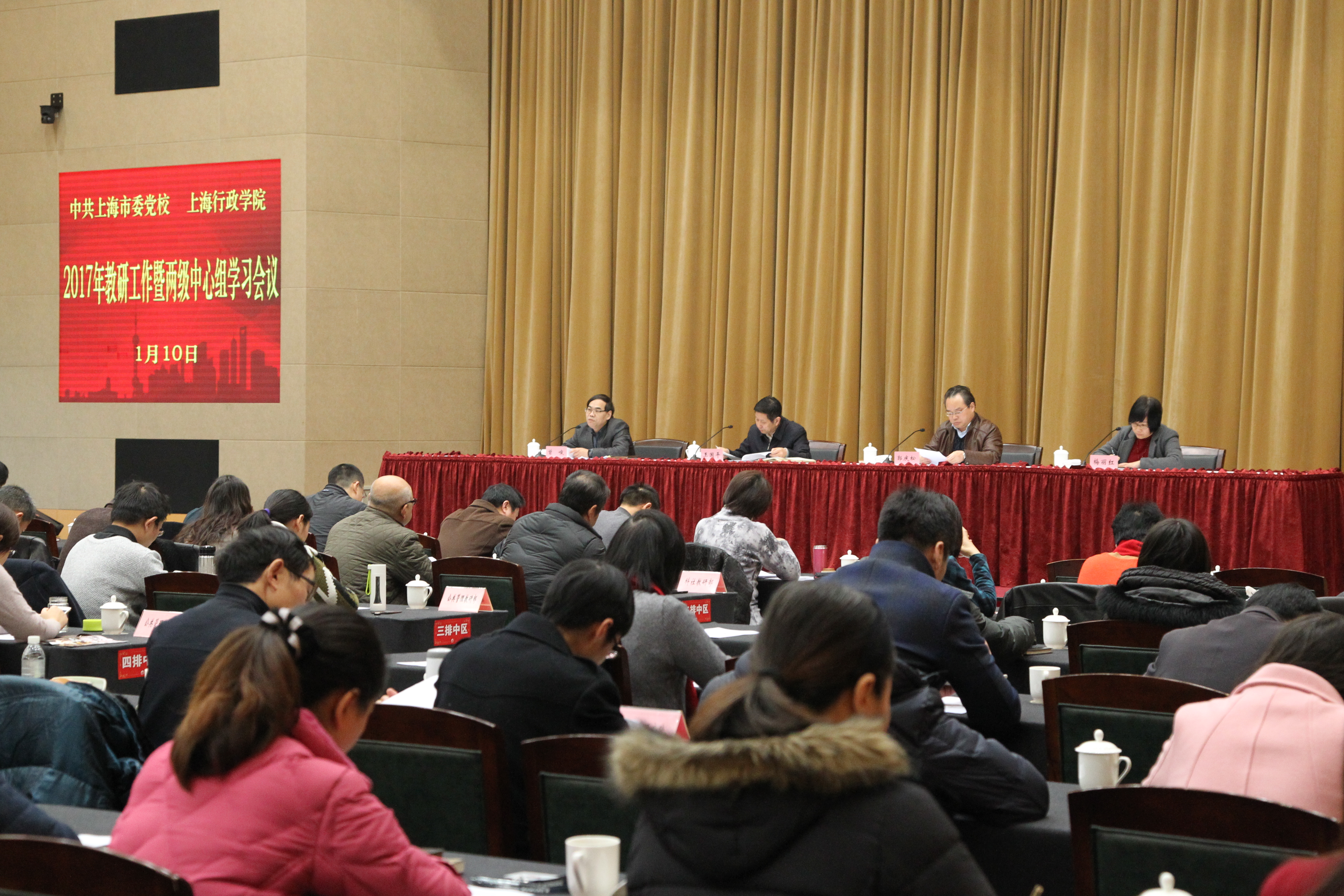 本网讯 1月10日上午,中共上海市委党校、上海行政学院2017年教研工作暨两级中心组学习会议在海华101报告厅举行。会议的前半部分由教育长梅丽红主持,副校院长曾峻、郭庆松分别总结了2016年教学科研情况,并对2017年教学科研工作进行了部署,常务副校院长王国平作总结讲话。会议的后半部分为两级中心组集体学习,由王国平传达上海十届市委十四次会议精神。校委委员、两级中心组成员、总校分校副处以上干部与总校全体教师共200余人参加了会议。