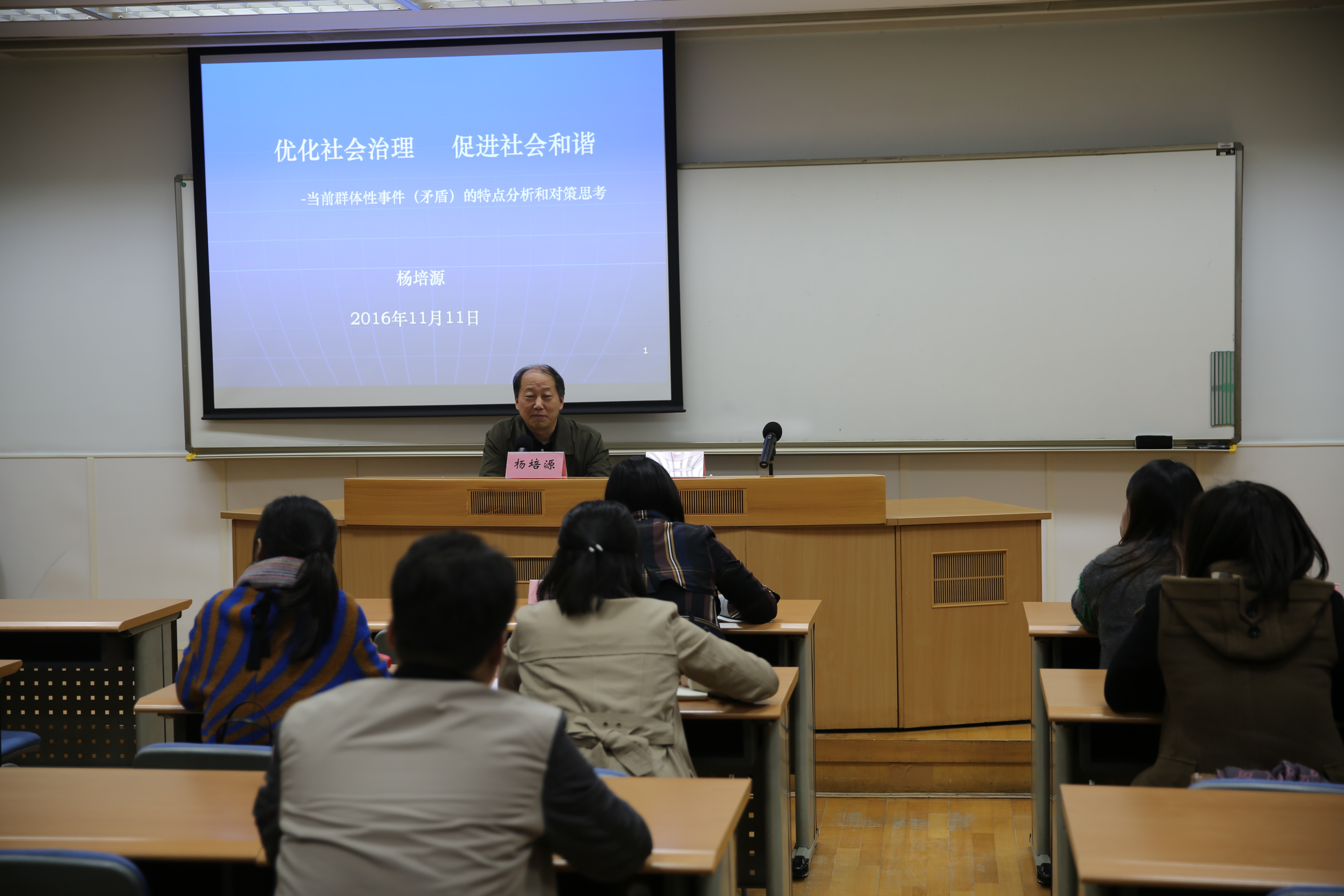 本网讯 11月11日晚,上海市委党校MPA公共管理论坛第一次讲座在海兴教学楼106教室举行。论坛邀请浦东新区原纪委书记杨培源作“优化社会治理,促进社会和谐——当前群体矛盾特点分析和对策思考”专题讲座。市委党校副校长曾峻出席论坛并就其开办的意义作了说明。2015级、2016级MPA班共43名同学参加了本次论坛。