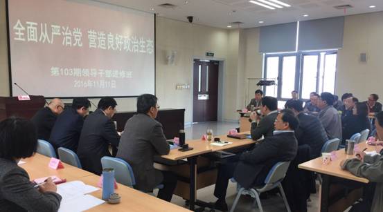 本网讯 11月11日上午,第103期领导干部进修班举行首次学员论坛,主题是“全面从严治党,营造良好政治生态”。沈华棣、向义海、袁建国、高德彪4位学员分别代表4个小组做重点发言。学习委员毛云琪主持论坛,科社教研部袁峰教授对4位同学的发言作了简短点评。