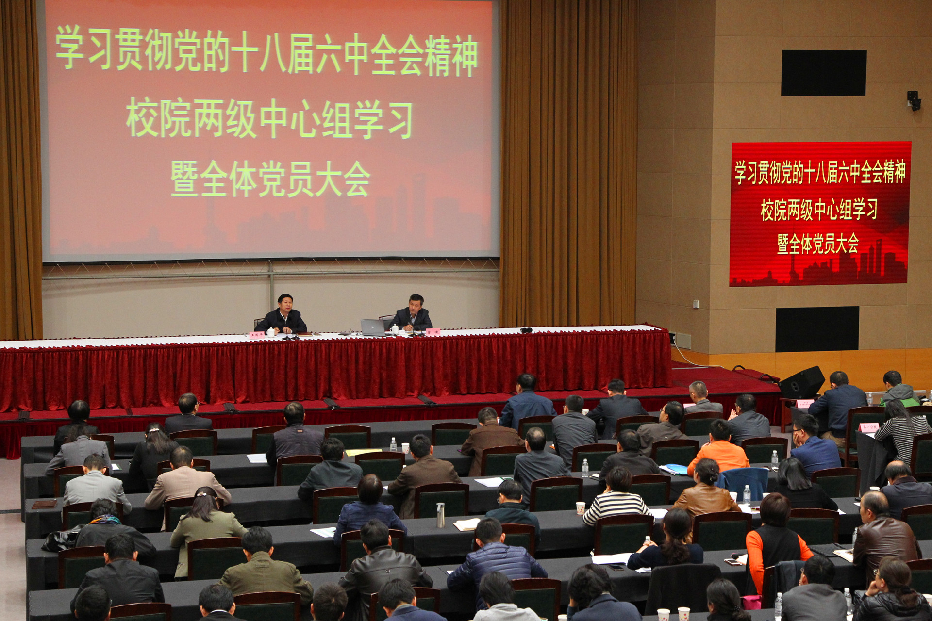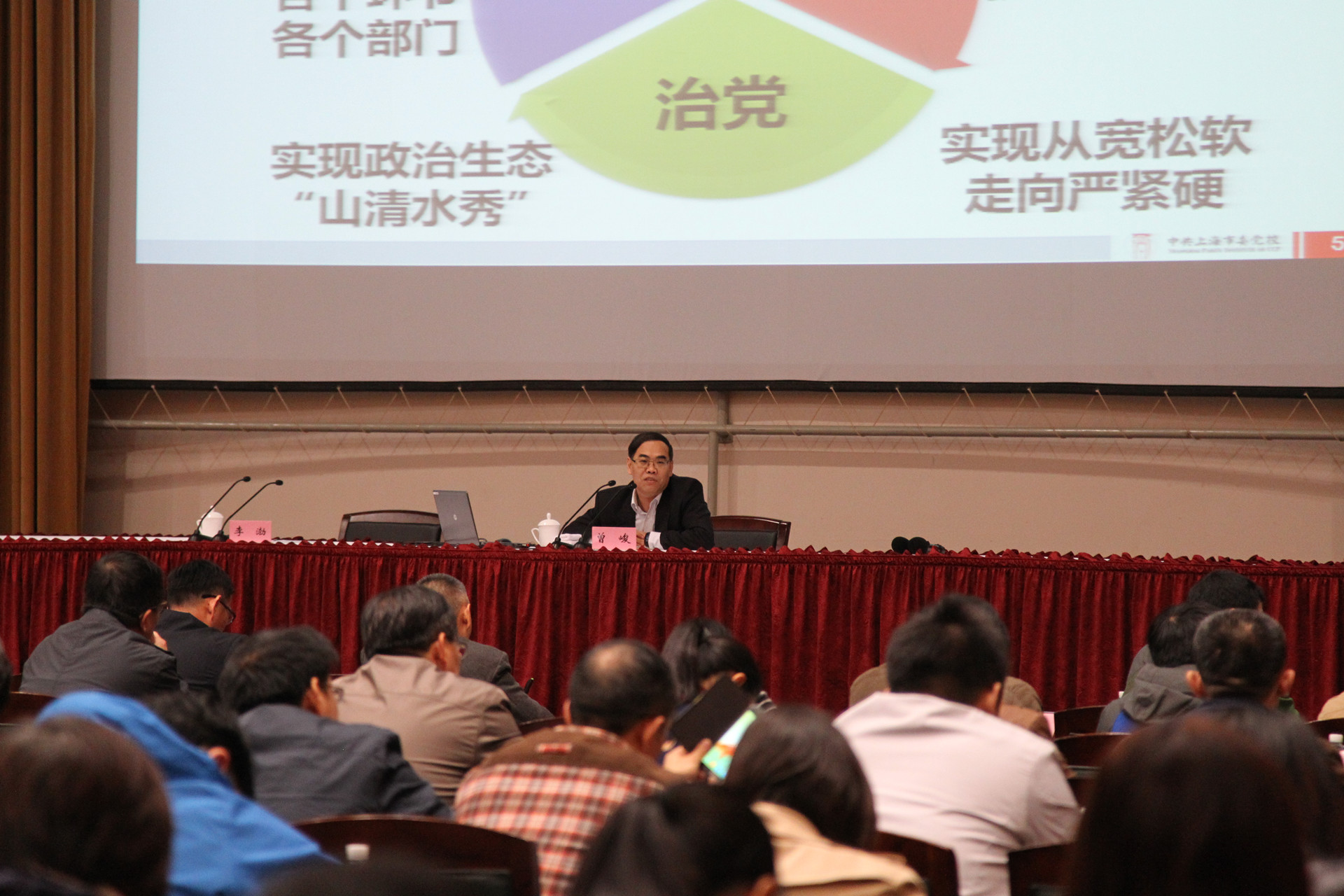 本网讯 11月8日下午,上海市委党校海华101报告厅座无虚席,学习贯彻党的十八届六中全会精神校院两级中心组学习暨全体党员大会在这里隆重举行。大会由副校院长李渤主持。全体党员观看了警示教育片《锈蚀》,聆听了副校院长曾峻做的党的十八届六中全会精神学习辅导讲座。常务副校院长王国平对校院学习贯彻六中全会精神进行了工作部署。市委党校总校两级中心组成员,总校和分校全体在职党员近500人参加了大会,市纪委驻市委组织部纪检组副组长崔世春全程参加了大会。