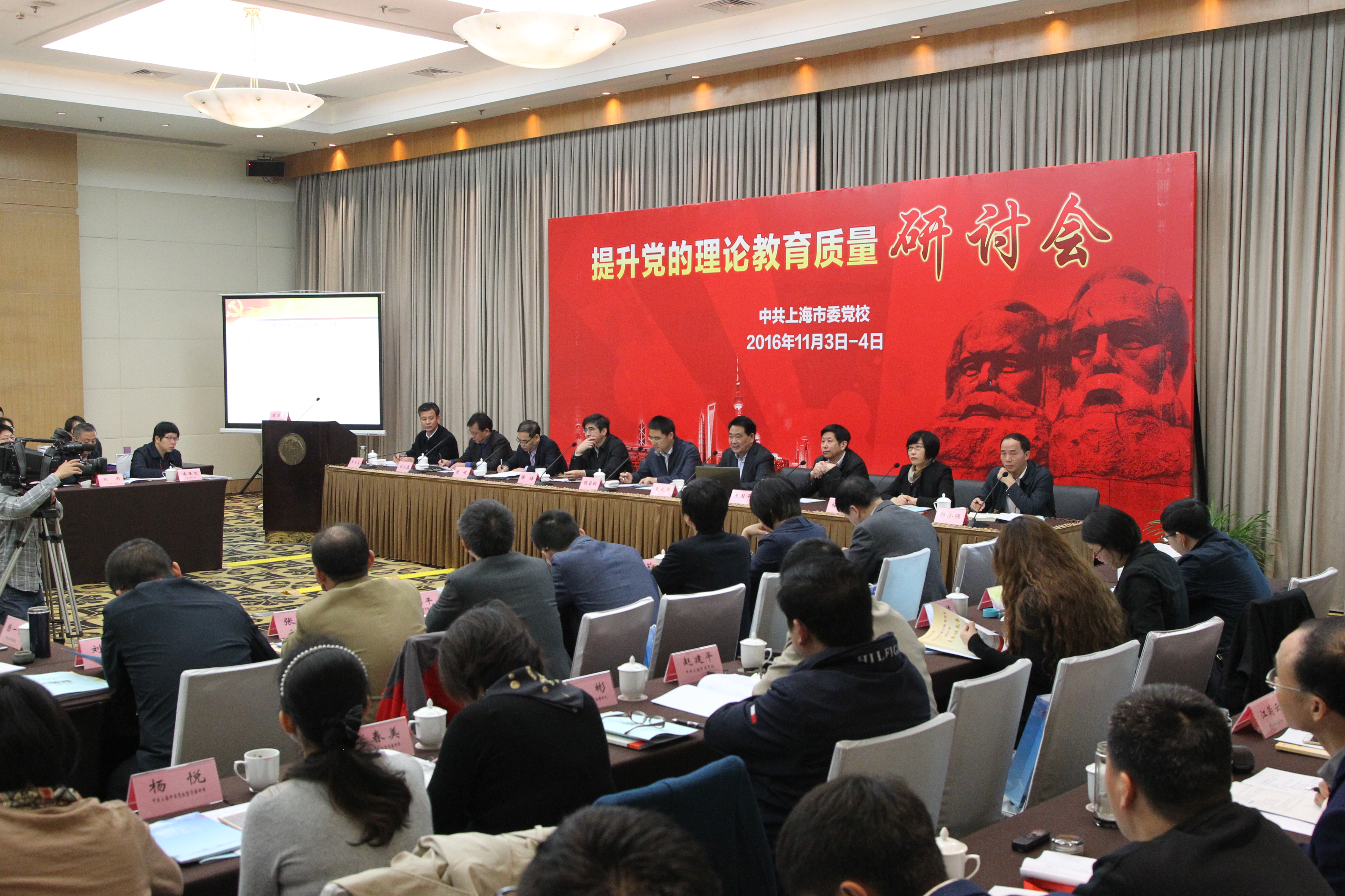 本网讯 11月3日至4日上午,由我校主办的提升党的理论教育质量研讨会在海兴教学楼举行。中组部干教局副局长程霜枫,中央党校教务部副主任王成志,市委组织部副部长、市委党校副校长陈皓,常务副校长王国平等出席开幕式并致辞。副校长曾峻主持开幕式、出席闭幕式并作研讨会总结。教育长梅丽红主持研讨会大会和闭幕式。来自中浦院、中井院、中延院等三所干部学院和30多家副省级以上党校,我校总校、分校以及本市16家区委党校的110余名专家学者与会。