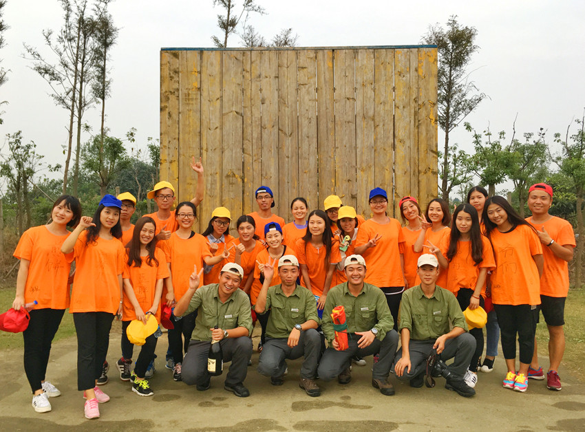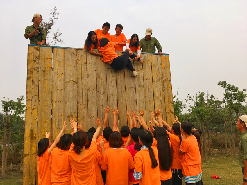 早上八点半全体成员在校门口上车,在车上大家进行了欢乐的自我介绍,使团队成员间很快熟悉了彼此。到达基地后首先进行热身训练,接着大家被分成三组,通过起队名、设计队徽、分组展示等团队文化建设初步形成了热烈的团队氛围。比赛项目正式开始后,各团队依次进行了群龙取水、信任背摔、穿越电网和九米高空单杠项目。每个项目结束后团队成员都要总结反思整个活动中的不足和收获,在每个看似不可能完成的项目中克服心理障碍、充分信任伙伴并勇于挑战自我。最后教练进行了整体总结并布置最后一个任务,在规定时间内全体成员不借助任何外力情况下翻越高4.2米的毕业墙。团队成员团结合作、密切配合,成功地完成了任务,团队气氛达到最高潮。