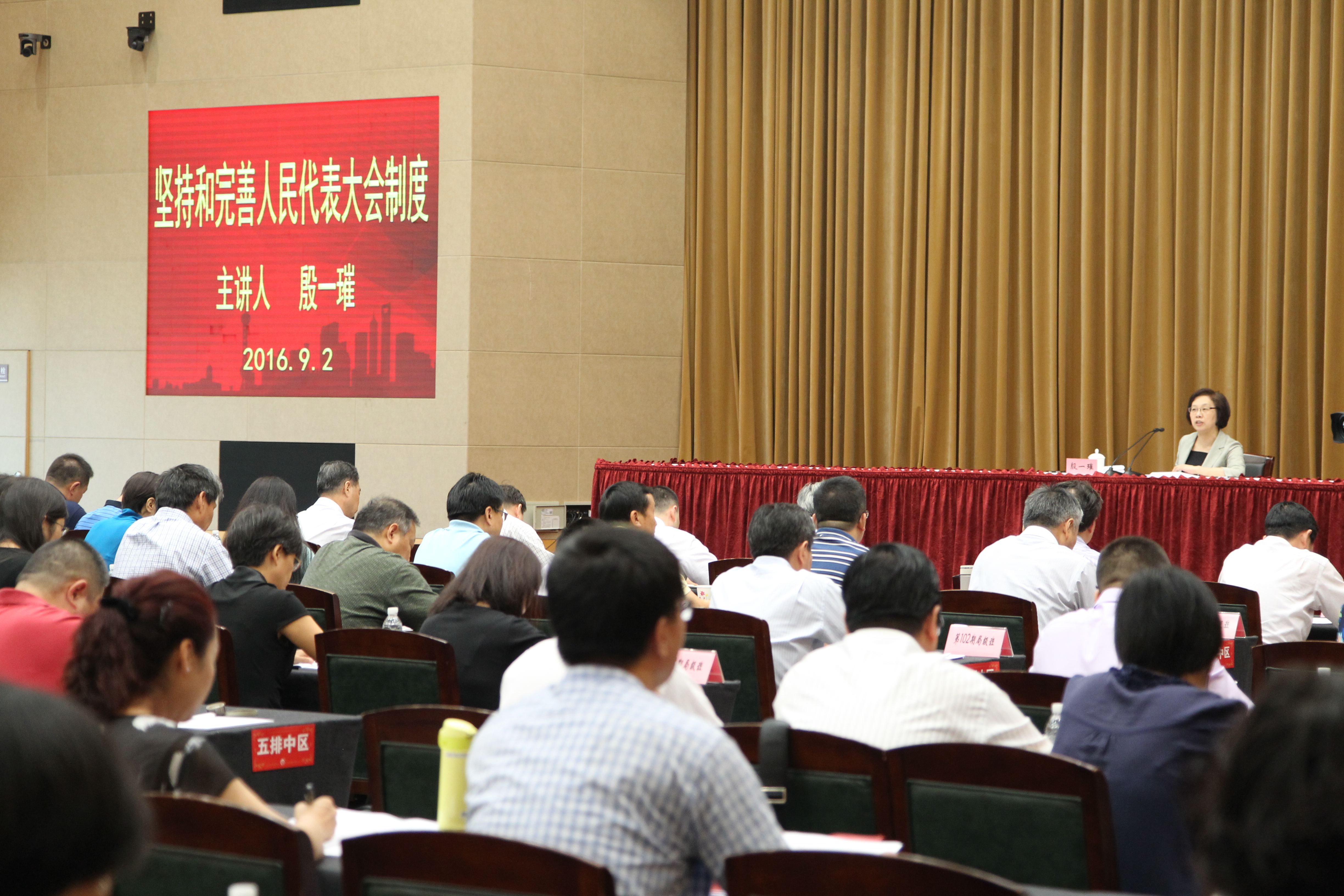 本网讯 9月2日上午,市人大常委会殷一璀主任应邀主讲科学发展讲坛,主题为“坚持和完善人民代表大会制度”。常务副校院长王国平主持报告会。