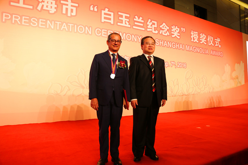 本网讯 2016年9月7日,意大利国家行政学院前院长、罗马大学特里亚教授携夫人,在上海行政学院副院长郭庆松的陪同下,参加上海市外办举办的2016上海市白玉兰纪念奖授奖仪式。上海市外办主任张小松向特里亚教授颁授证章、证书。