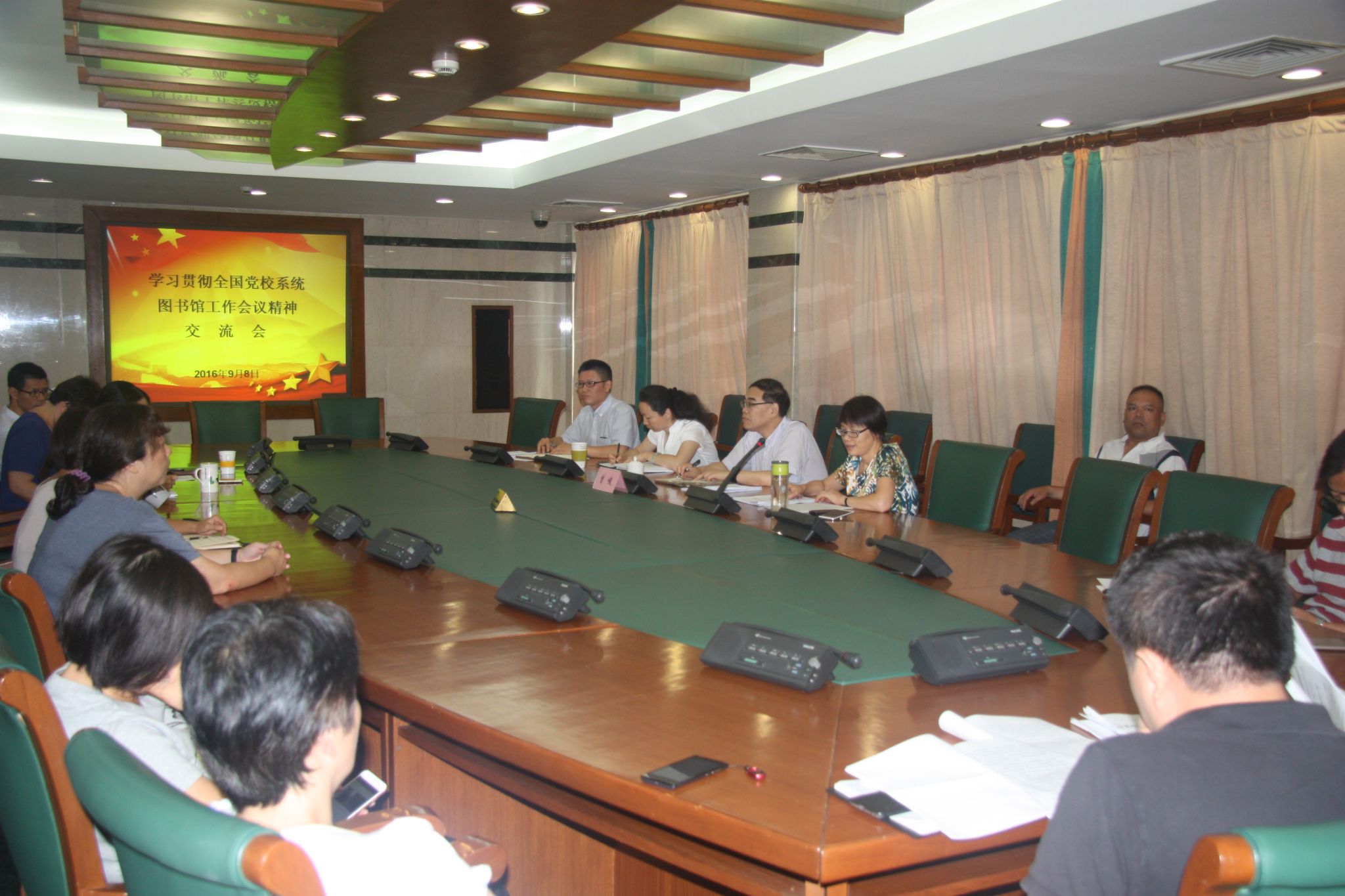 本网讯 9月8日上午,学习贯彻全国党校系统图书馆工作会议精神交流会在图书馆第一会议室召开。副校院长曾峻出席会议并讲话,图书馆馆长唐月娥主持交流会,图书馆全体人员参加。
