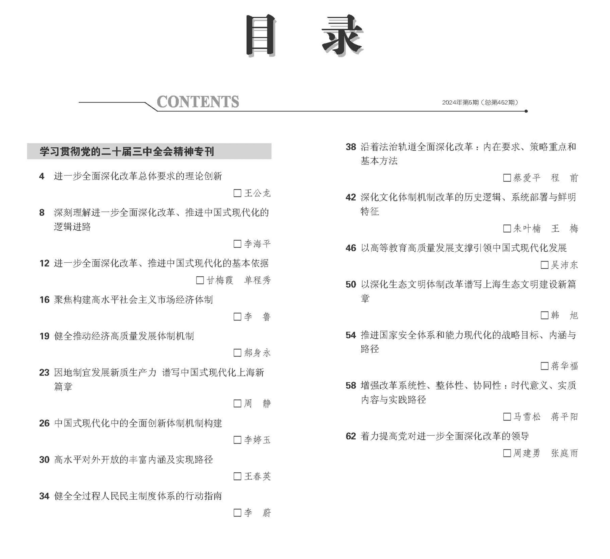 2024年7月15-18日,党的二十届三中全会胜利召开。编辑部在《中共中央关于进一步全面深化改革、推进中国式现代化的决定》(以下简称《决定》)公布后,第一时间组织专题学习,认真研读《决定》内容。结合上海市党校系统学习贯彻党的二十届三中全会精神专题师资培训班的主旨发言,编辑部认真落实校委持续推进教研咨一体化的要求,与发言的骨干教师定向约稿、沟通选题,按照“时度效”的原则,坚持问题导向、学理取向与实践支撑,打磨稿件内容,组织了一批学习阐释党的二十届三中全会精神的稿件,并最终形成了专刊的主要内容。
